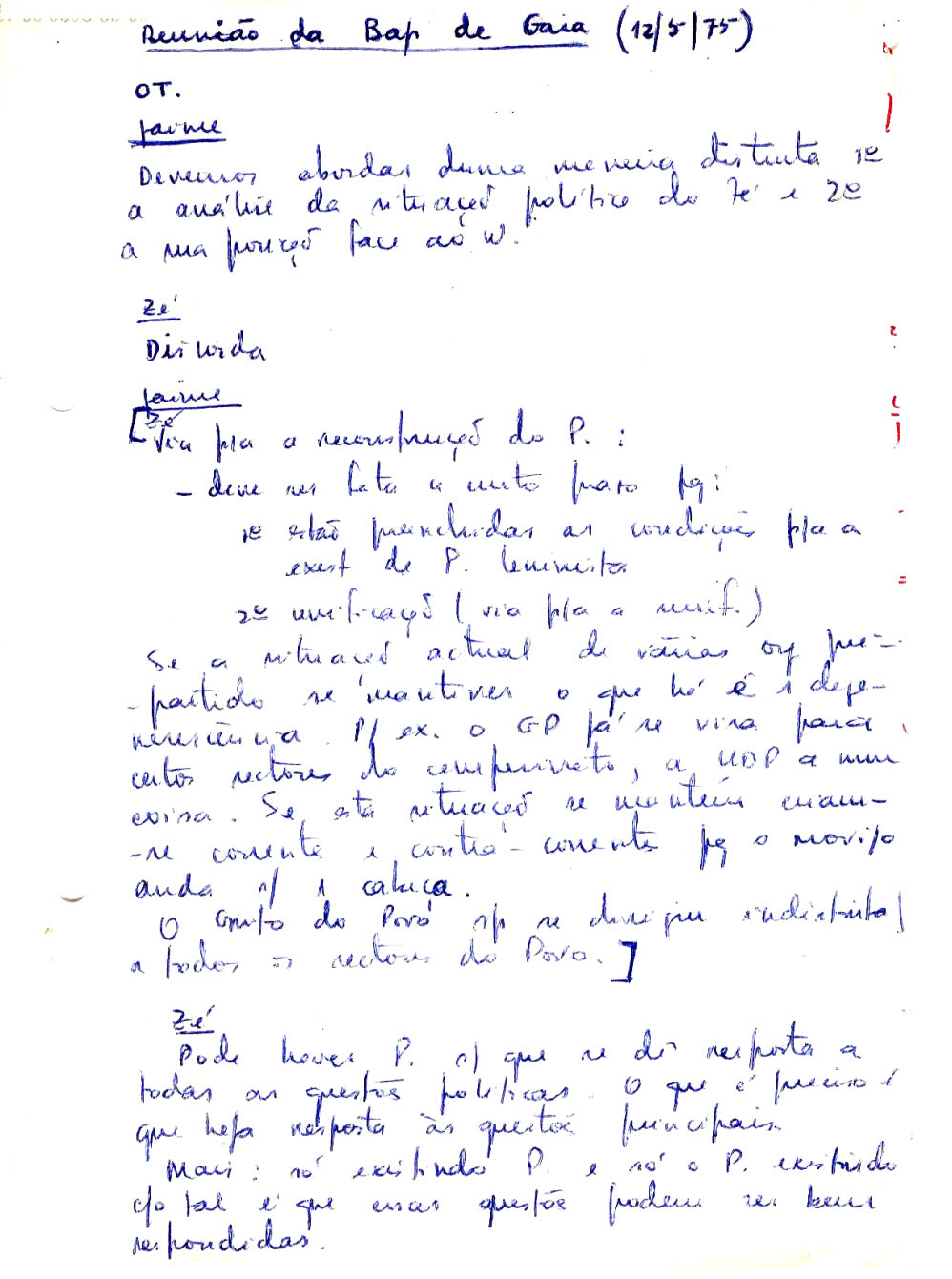 Notas tiradas por Isabel Seabra, dirigente da UEC(ml), duma reunião da Brigada de Agitação e Propaganda de V. N. de Gaia, em 12 de Maio de 1975. As BAPs foram criadas no processo de dissolução do PCP(ml) , grupo do interior ligado a “Mendes”, que iria retomar o antigo nome de CMLP, até se integrar no PCP(R). As BAPs eram uma organização de transição, semi-legal (daí a identificação dos intervenientes pelos nomes próprios), com objectivo de despromover os quadros que tinham sido responsáveis pelo PCP(ml), para tarefas de “base”, como distribuir jornais e panfletos.
