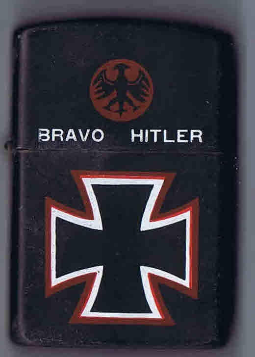 Porta-chaves (do Movimento Sociale Italiano e cruz céltica) e isqueiro apologético de Hitler com a “cruz de ferro”.