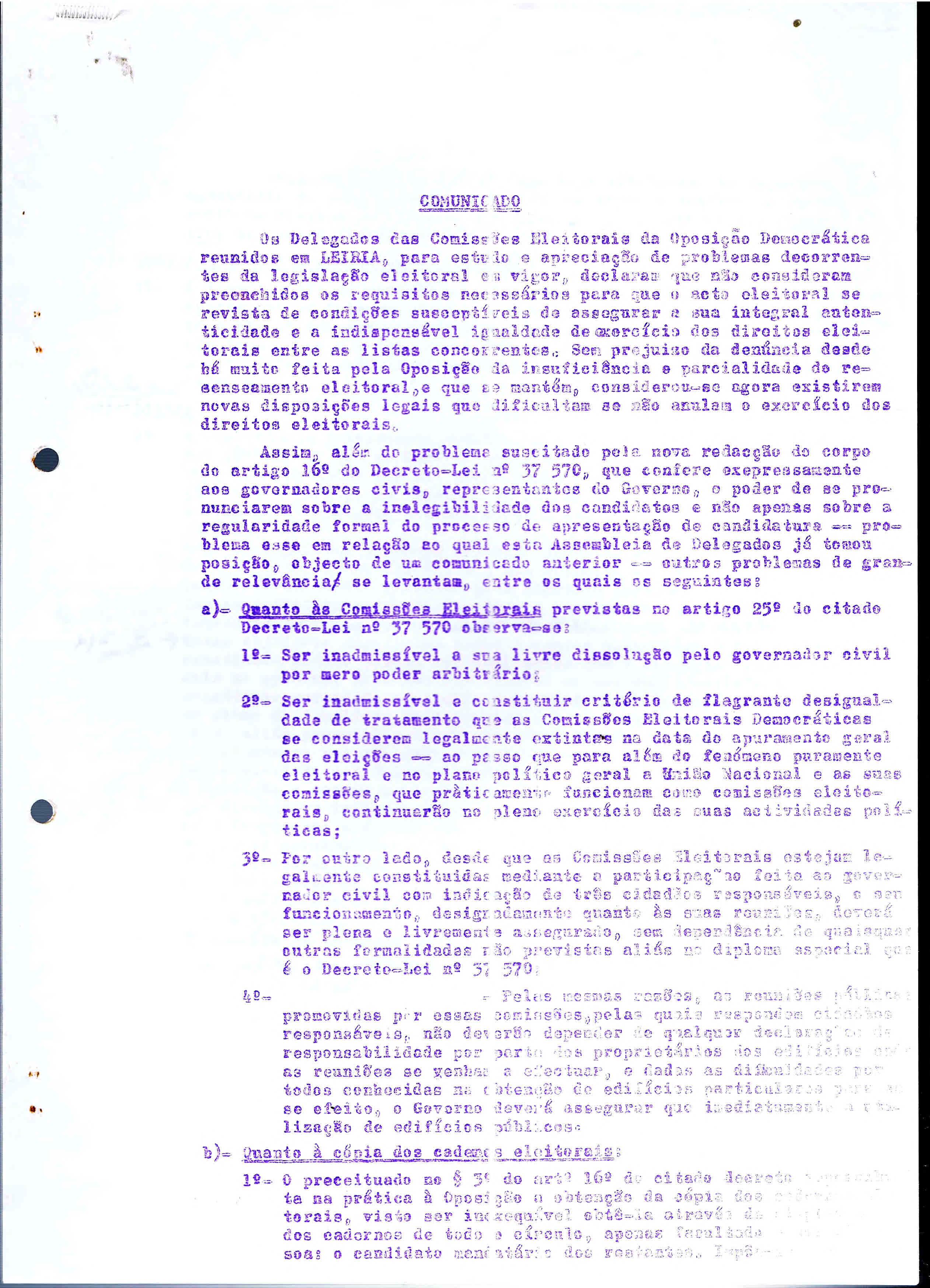 Comissão Democrática Eleitoral do Distrito de Leiria – Serviços de Candidatura, Comunicado de Imprensa nº4, Leiria, 8 de Setembro de 1969.