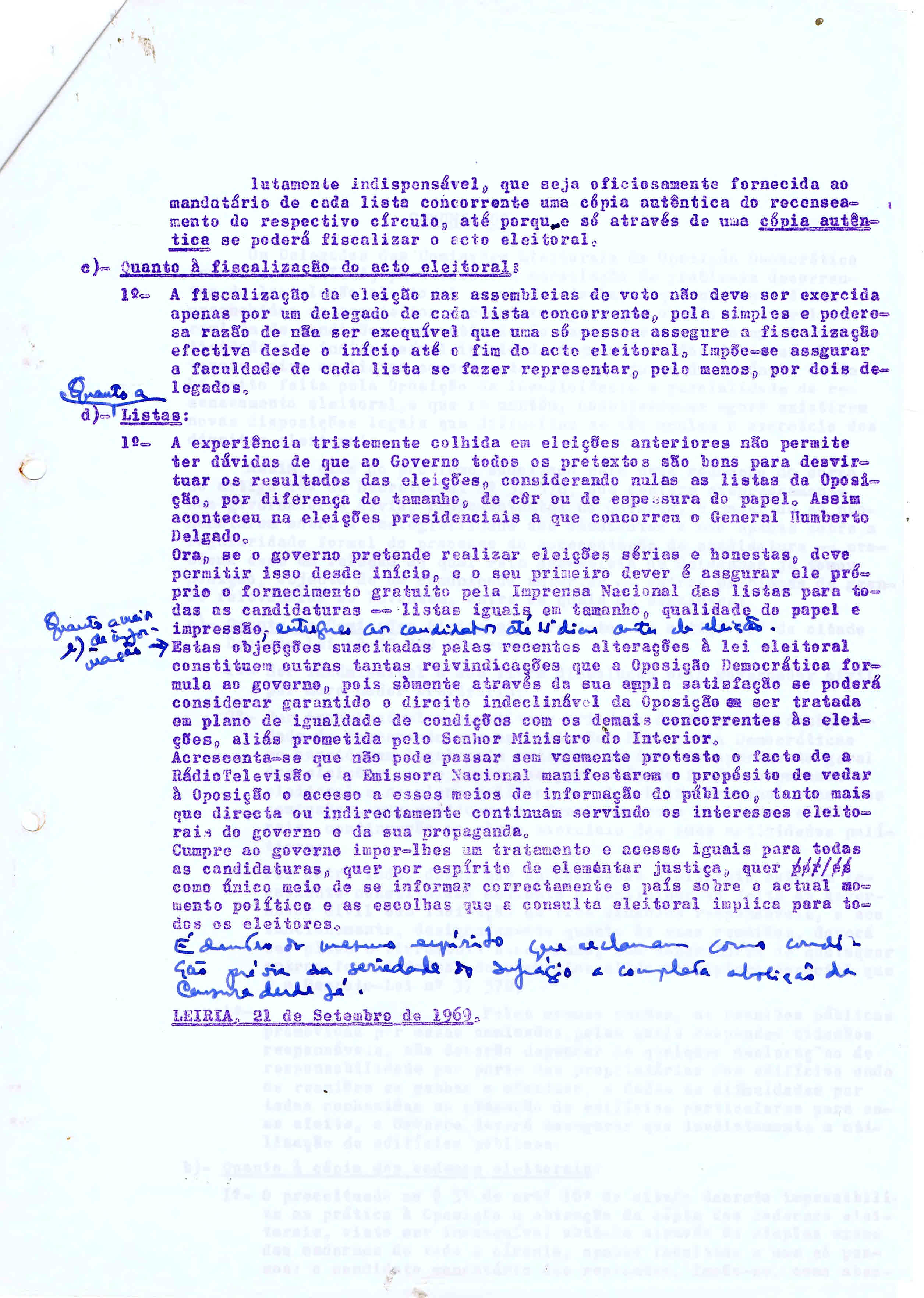 Comunicado, Leiria, 23 de Setembro de 1969. (uma das versões com anotações manuscritas).