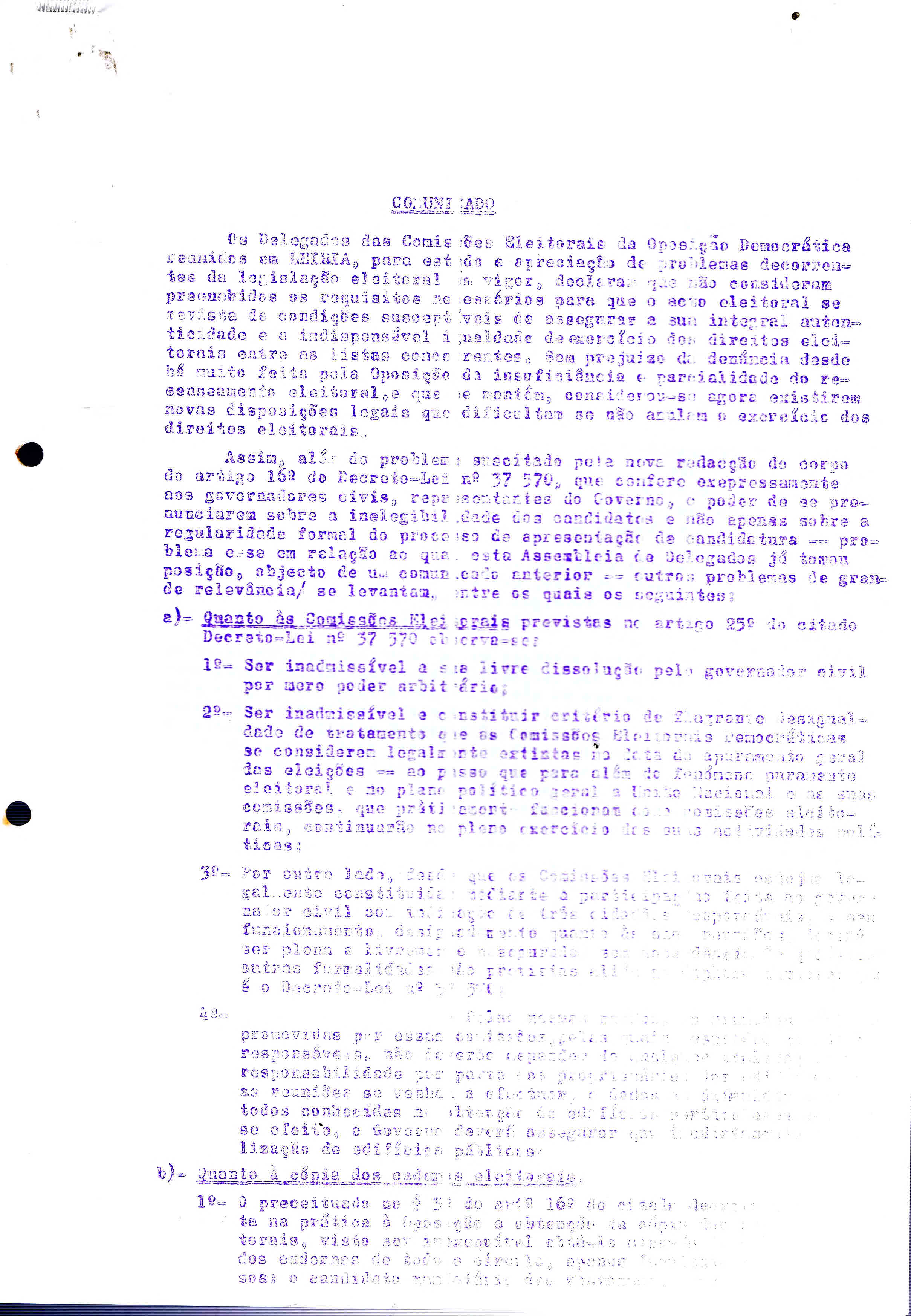 Comissão Democrática Eleitoral do Distrito de Leiria, Prezados Correlegionários, Leiria, 10/6/1969. (texto alterado para preto e branco para ser legível).