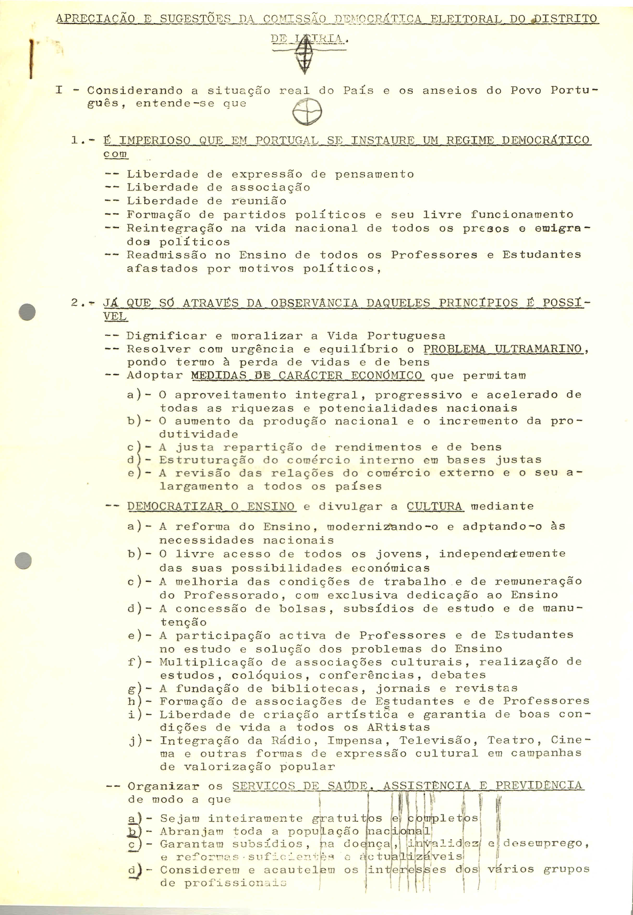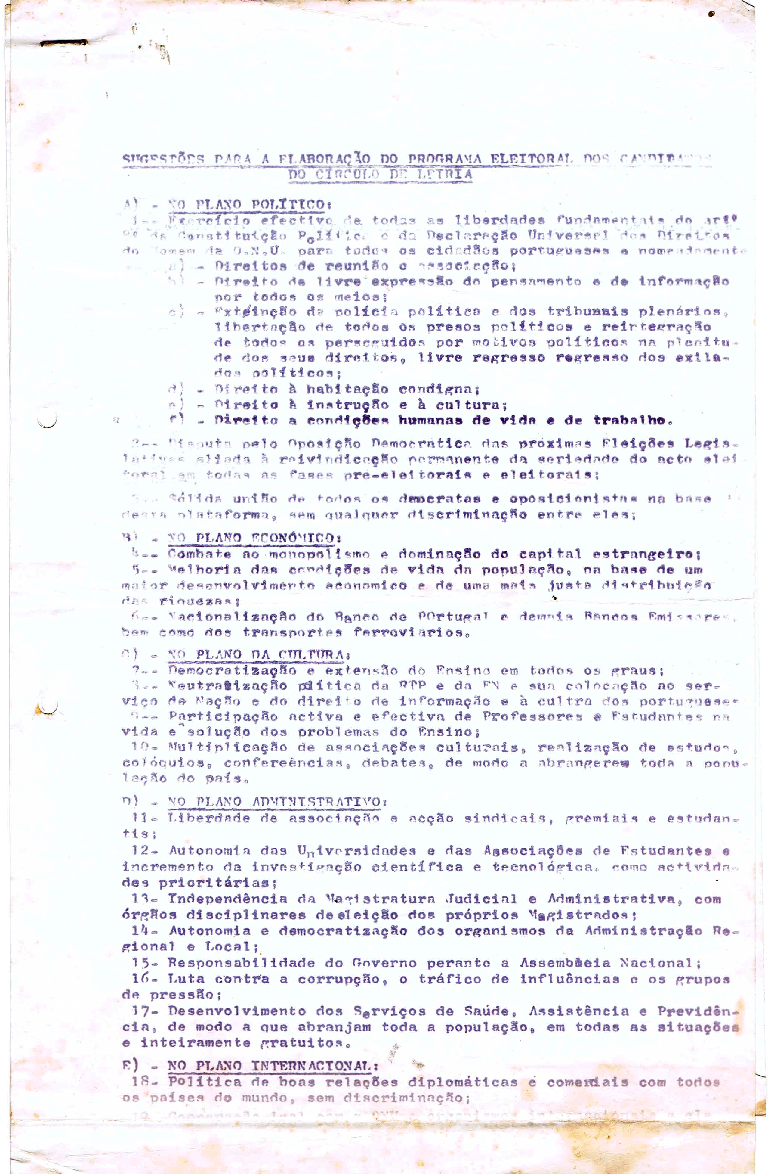 Sugestões para a a Elaboração do Programa Eleitoral dos Candidatos do Círculo de Leiria , Conforme Deliberação do Plenário Distrital de 14 de Junho de 1969.