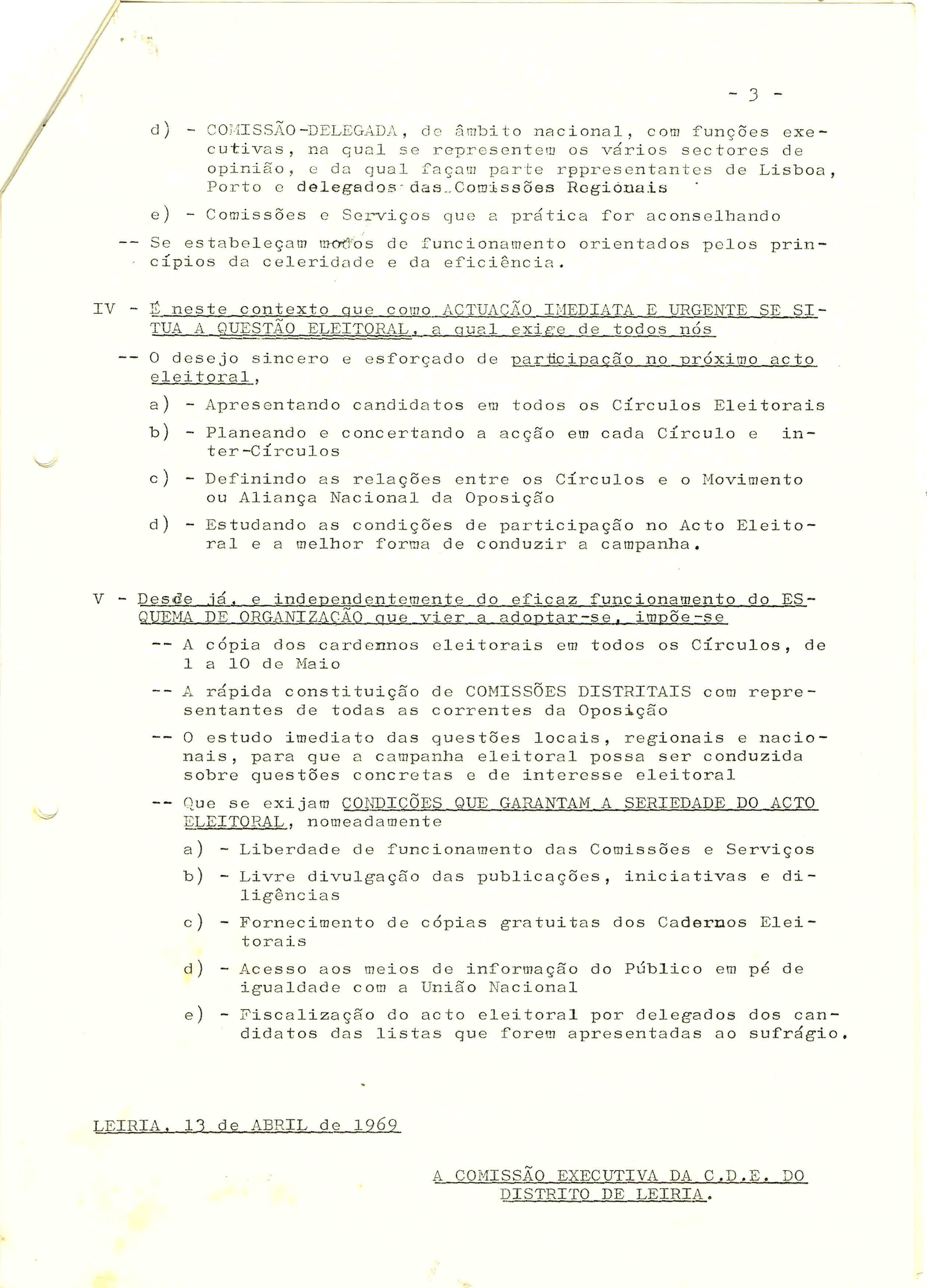 Comissão Executiva da CDE do Distrito de Leiria, Apreciação e Sugestões da Comissão Democrática Eleitoral do Distrito de Leiria, Leiria, 13 de Abril de 1969.
