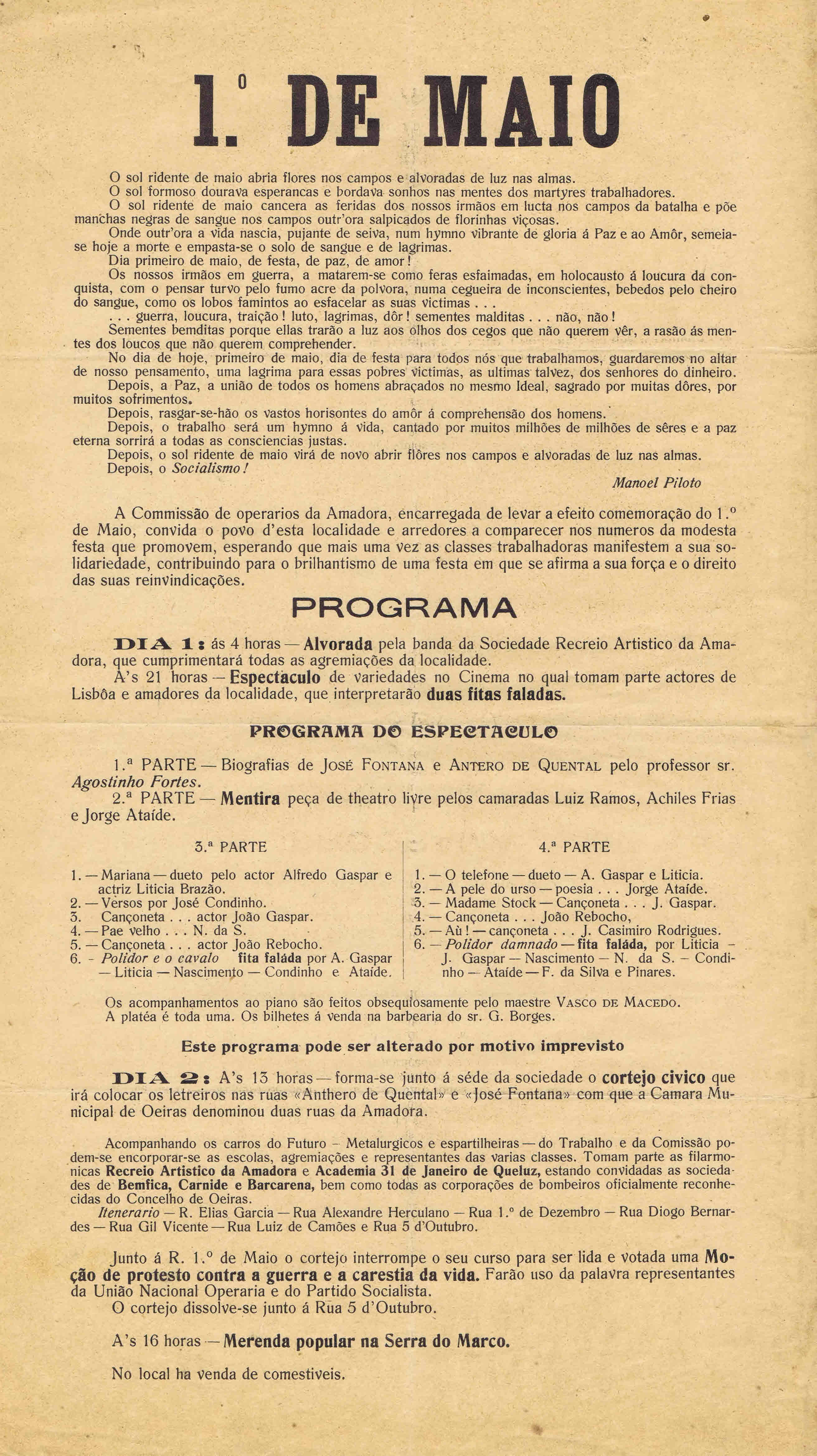Entraram no ARQUIVO / BIBLIOTECA, por aquisição num leilão, uma série de manuscritos (livros de actas de actas da Casa do Povo de Lisboa e da Federação Municipal Socialista), manifestos, panfletos, periódicos e programas ligados ao movimento operário e socialista na I República. Um desses documentos é o apelo à comemoração e programa do 1º de Maio, com origem no movimento socialista, não datado, mas possível de identificar como sendo de meados da década de dez no século XX, entre 1914 e 1918.