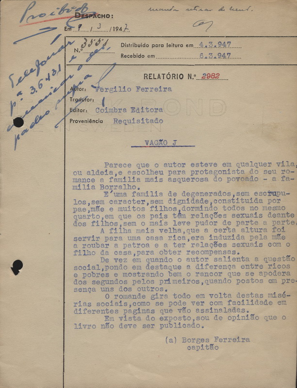 CENSURA – RELATÓRIO Nº 2982 (9 DE MARÇO DE 1947) RELATIVO A “VAGÃO J” DE VERGÍLIO FERREIRA 06/02/2012 JPP 1947, ARQUIVO, ARQUIVO DA CENSURA, Censura, Documentos, Ferreira, Vergílio, Originais dactilografados 0 Print (Opens in new window) Print Email a link to a friend (Opens in new window) Email Share on Facebook (Opens in new window) Facebook Share on X (Opens in new window) X Share on LinkedIn (Opens in new window) LinkedIn Like this:Like Loading...