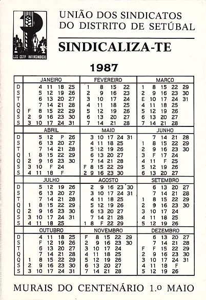 CGTP – UNIÃO DOS SINDICATOS DO DISTRITO DE SETÚBAL – CALENDÁRIOS (1987) 06/04/2013 JPP ARQUIVO, Calendários, CONFEDERAÇÃO GERAL DOS TRABALHADORES PORTUGUESES (CGTP), Setúbal, Sindicalismo, UNIÃO DOS SINDICATOS DE SETÚBAL 0 Print (Opens in new window) Print Email a link to a friend (Opens in new window) Email Share on Facebook (Opens in new window) Facebook Share on X (Opens in new window) X Share on LinkedIn (Opens in new window) LinkedIn Like this:Like Loading...