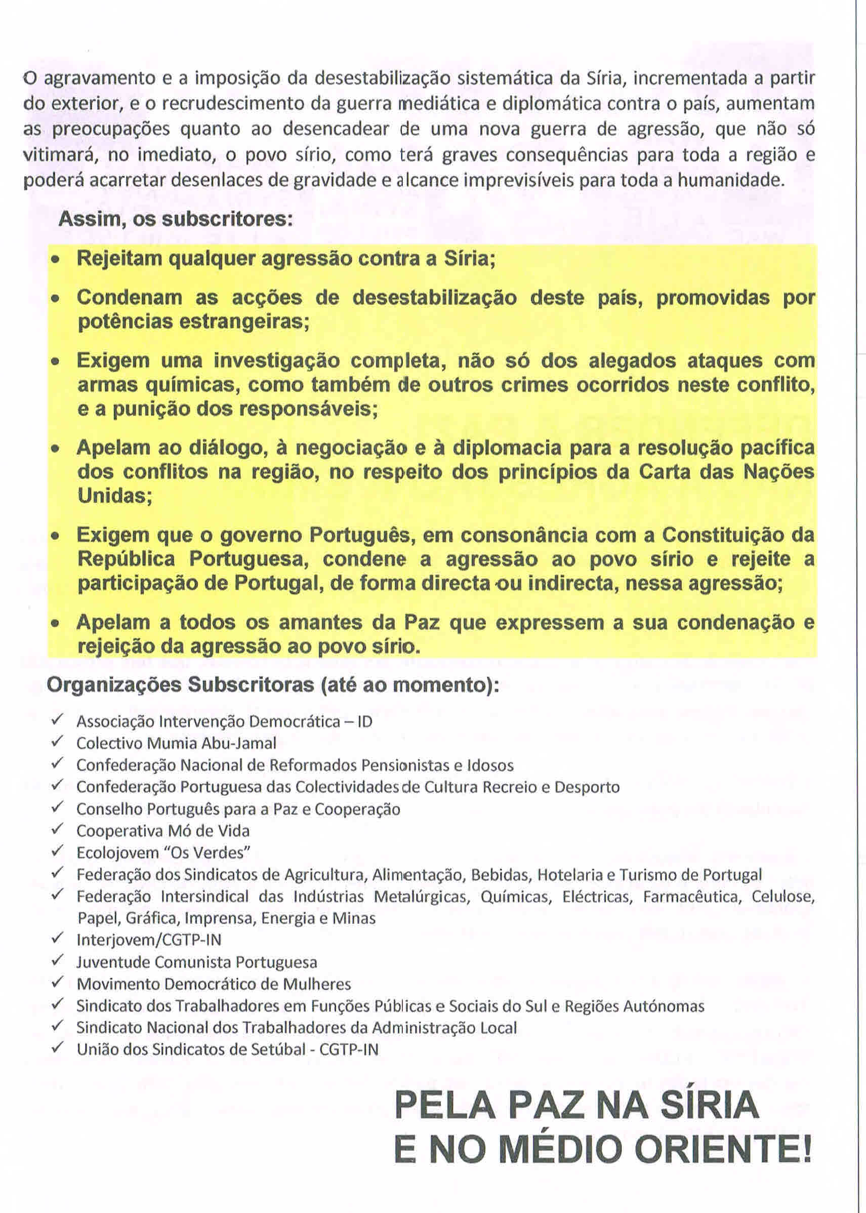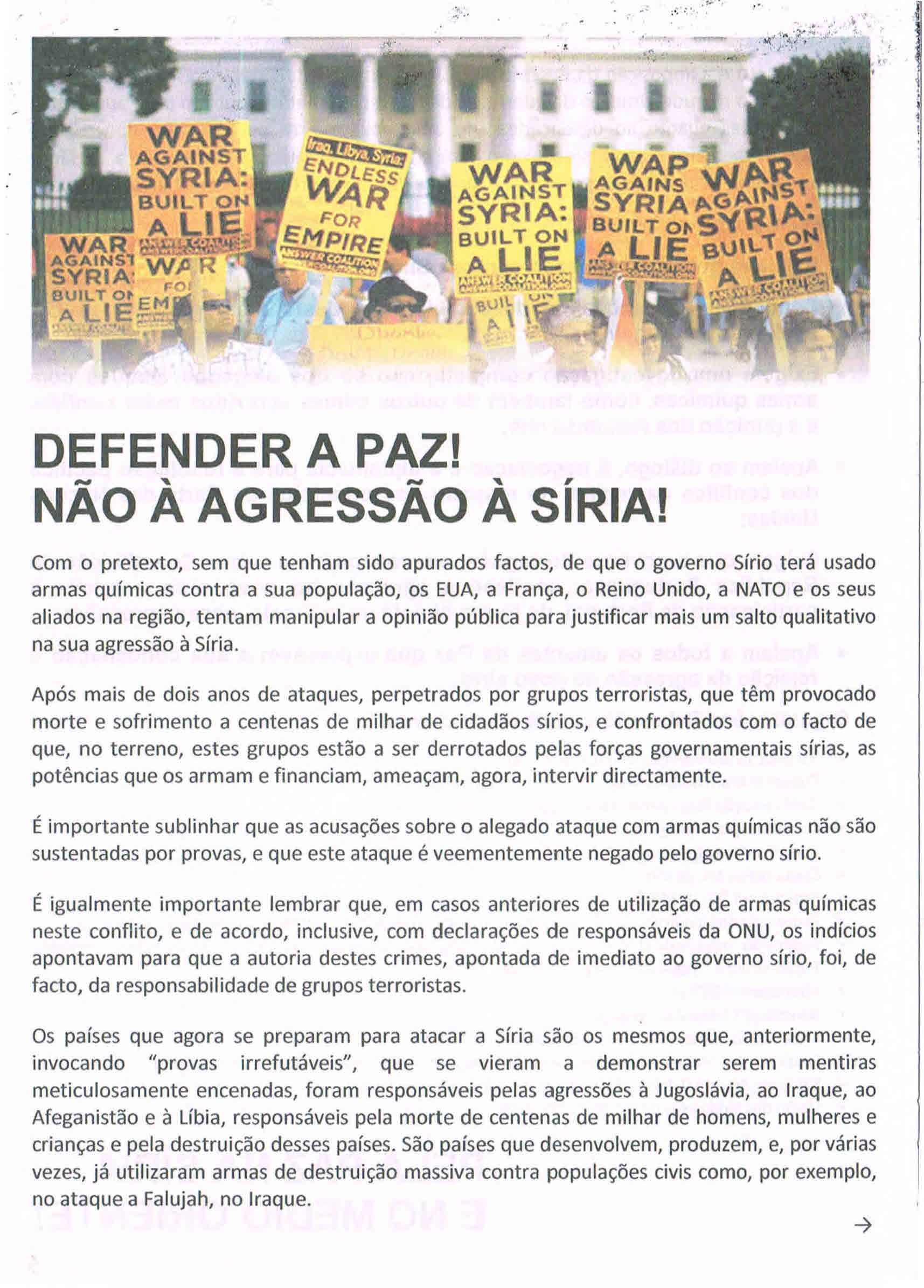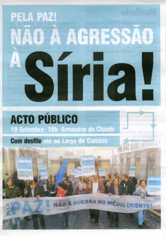 NÃO À AGRESSÃO À SÍRIA – ACTO PÚBLICO (LISBOA, 19 DE SETEMBRO DE 2013) 25/09/2013 JPP 2013, ARQUIVO, CONSELHO PORTUGUÊS PARA A PAZ E COOPERAÇÃO (CPPC), Lisboa, Manifestações protestos, Movimentos: pacifismo / contra as guerras, Panfletos - folhetos - folhas volantes - prospectos tarjetas, Síria 0 ACTUALIZADO Print (Opens in new window) Print Email a link to a friend (Opens in new window) Email Share on Facebook (Opens in new window) Facebook Share on X (Opens in new window) X Share on LinkedIn (Opens in new window) LinkedIn Like this:Like Loading...