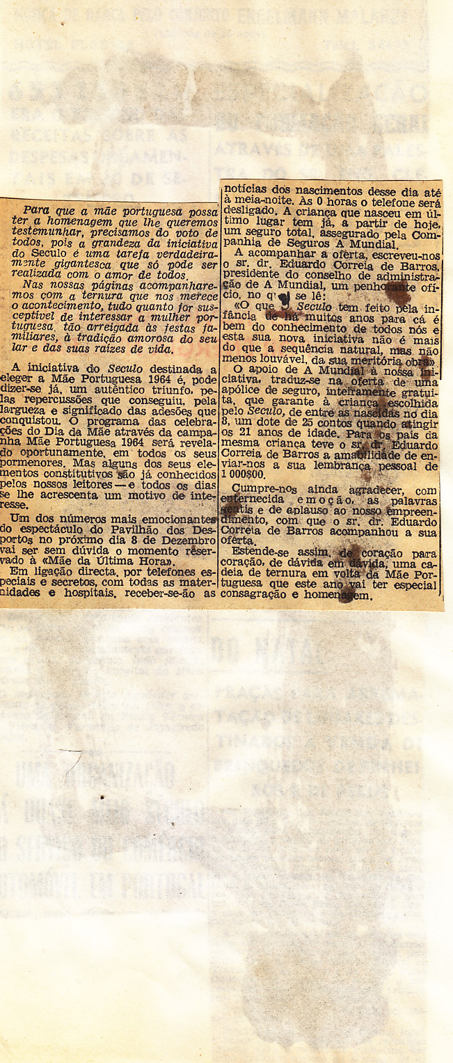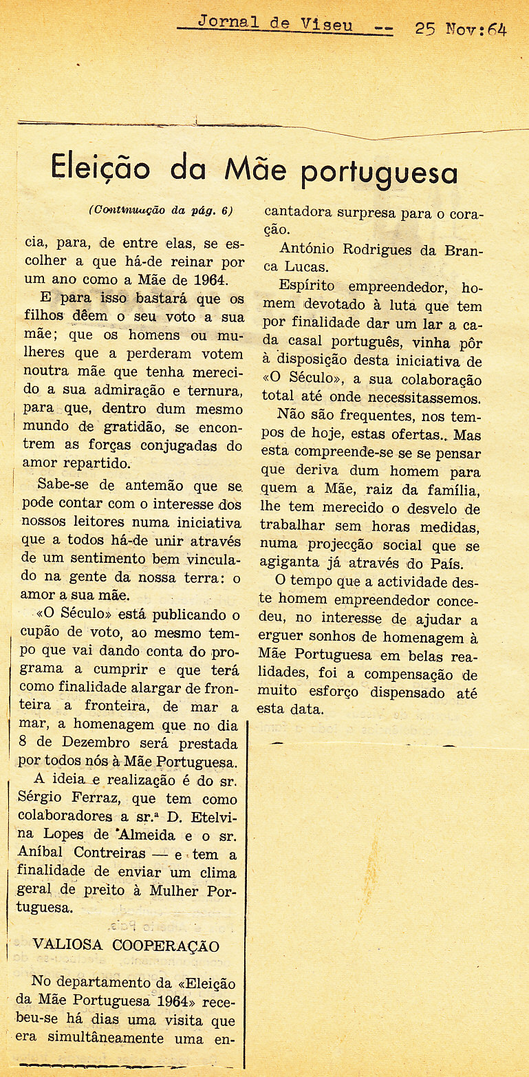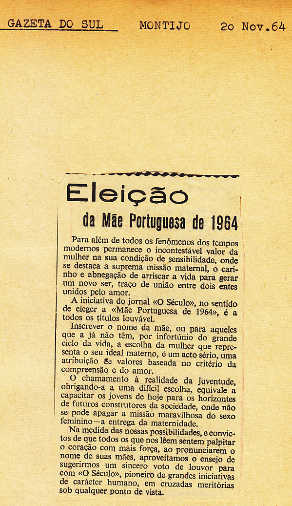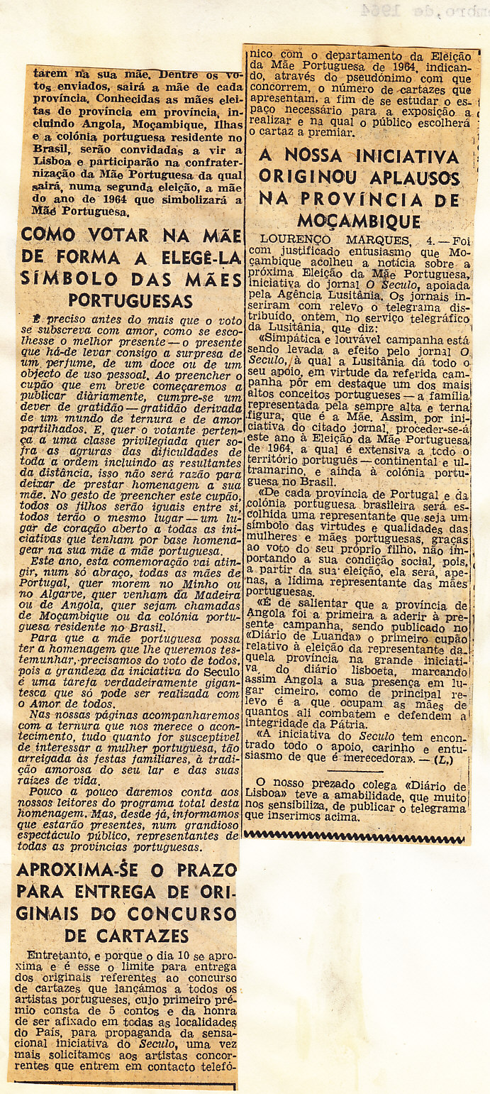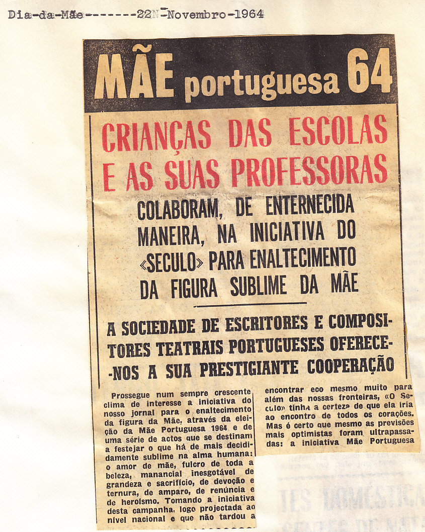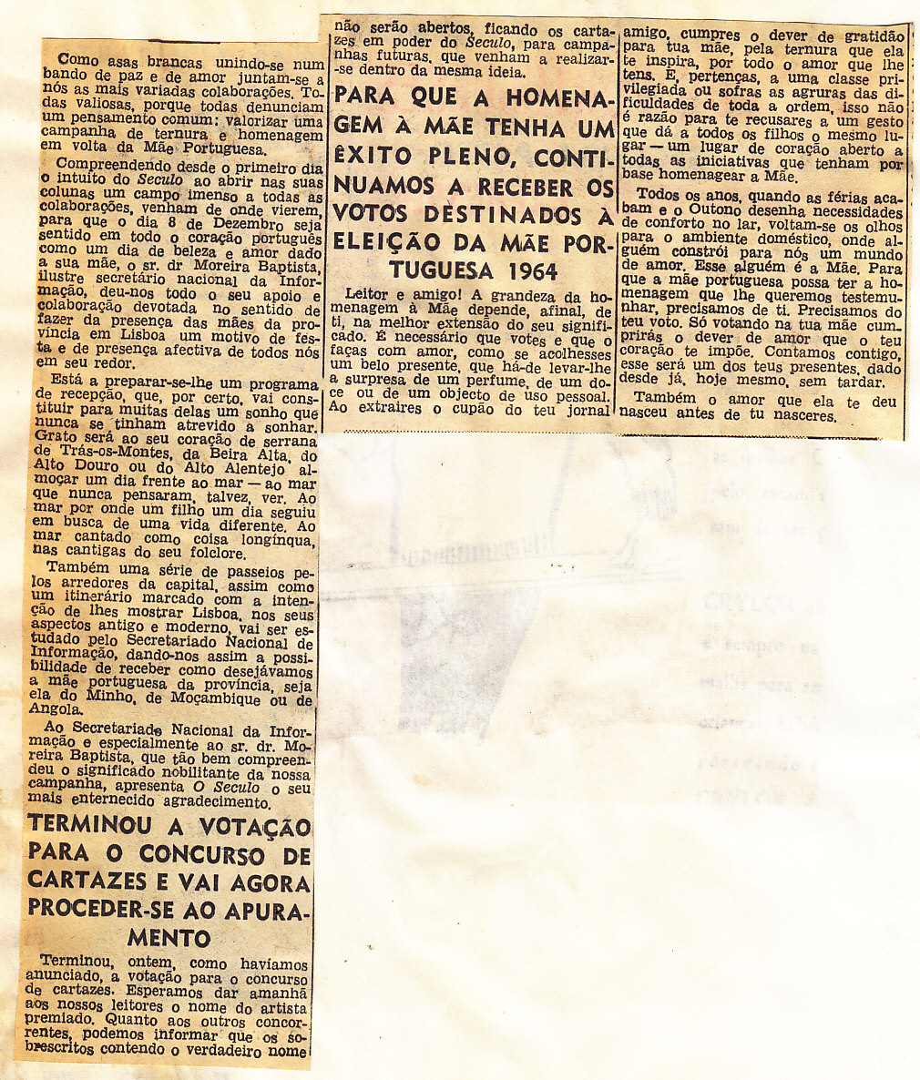Entrou, por aquisição, um dossier de fotografias, recortes, panfletos e outros materiais relativos à “Eleição da Mãe Portuguesa” em 1964. O dossier inclui alguns documentos pessoais de Sérgio Ferraz, jornalista, que em conjunto com o jornal O Século organizou a iniciativa. Sérgio Ferraz foi pioneiro de algumas formas de publicidade, como era o caso dos sinais luminosos. Para além disso, estão incluídas fotografias, bilhetes, e recortes relativos ao evento.