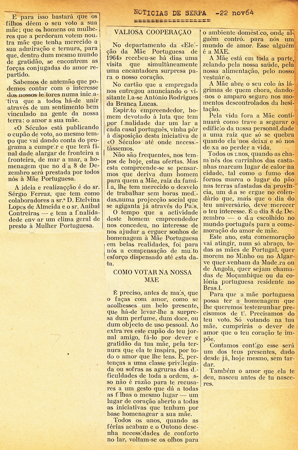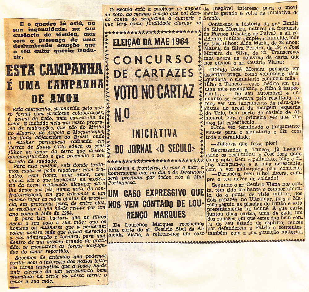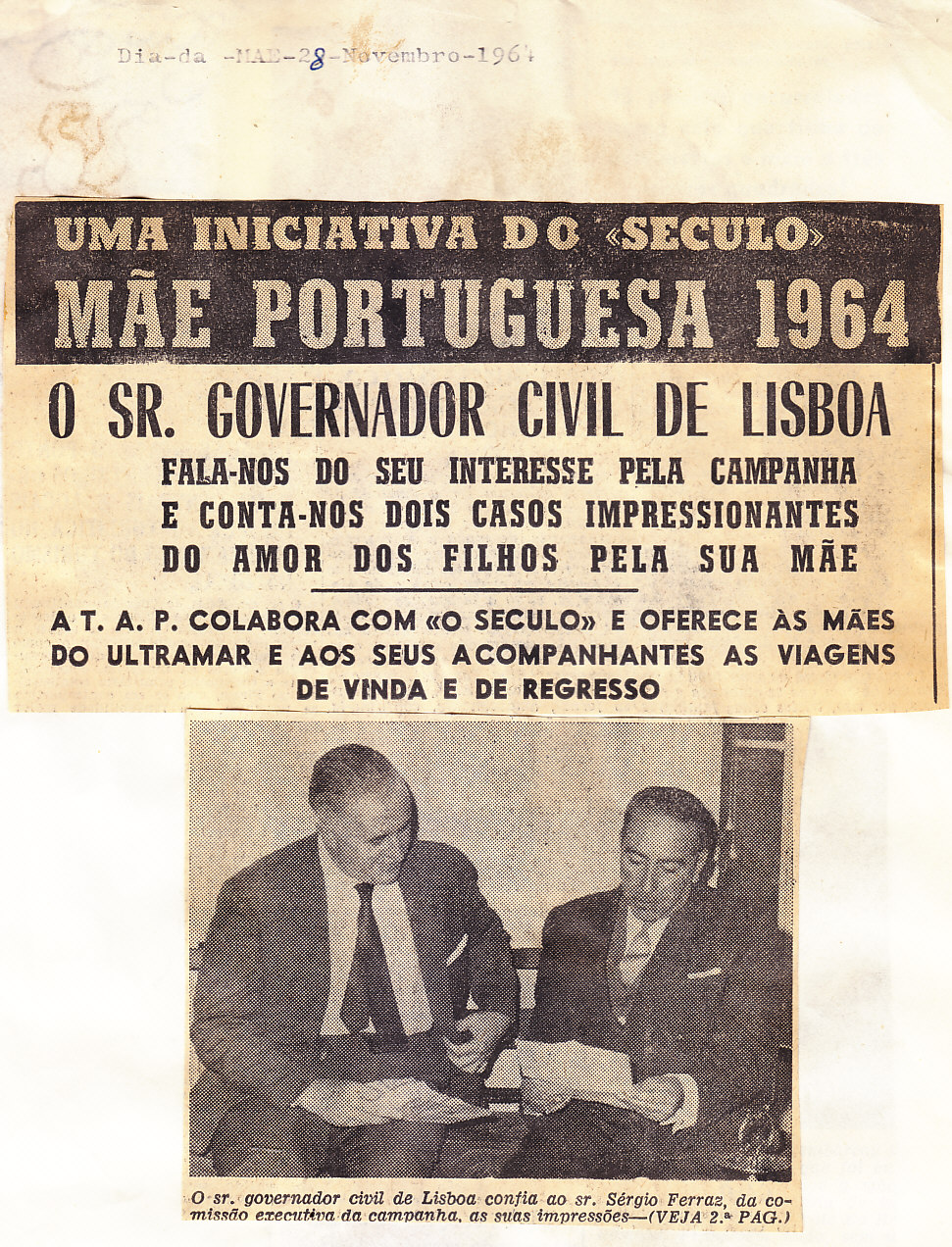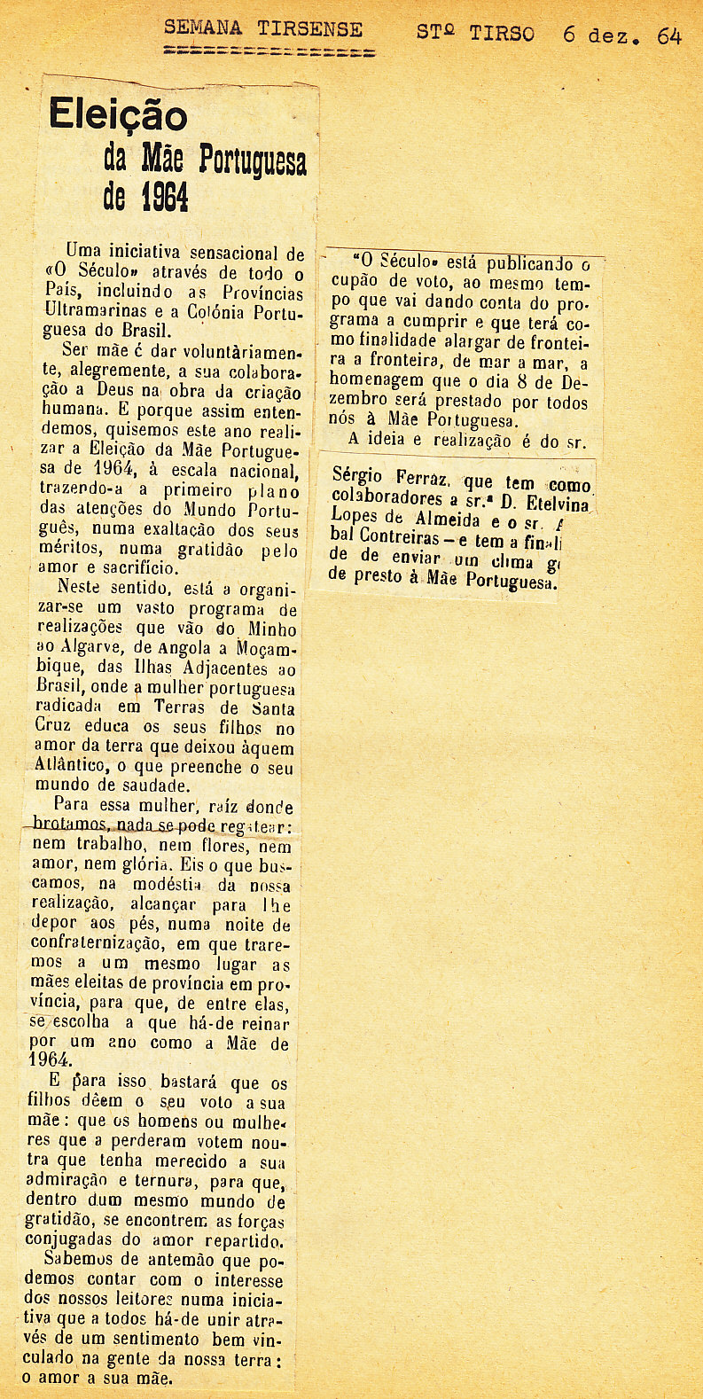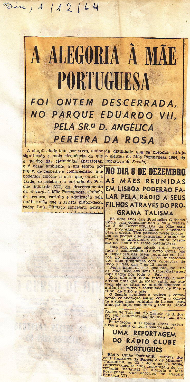 Entrou, por aquisição, um dossier de fotografias, recortes, panfletos e outros materiais relativos à “Eleição da Mãe Portuguesa” em 1964. O dossier inclui alguns documentos pessoais de Sérgio Ferraz, jornalista, que em conjunto com o jornal O Século organizou a iniciativa. Sérgio Ferraz foi pioneiro de algumas formas de publicidade, como era o caso dos sinais luminosos. Para além disso, estão incluídas fotografias, bilhetes, e recortes relativos ao evento.