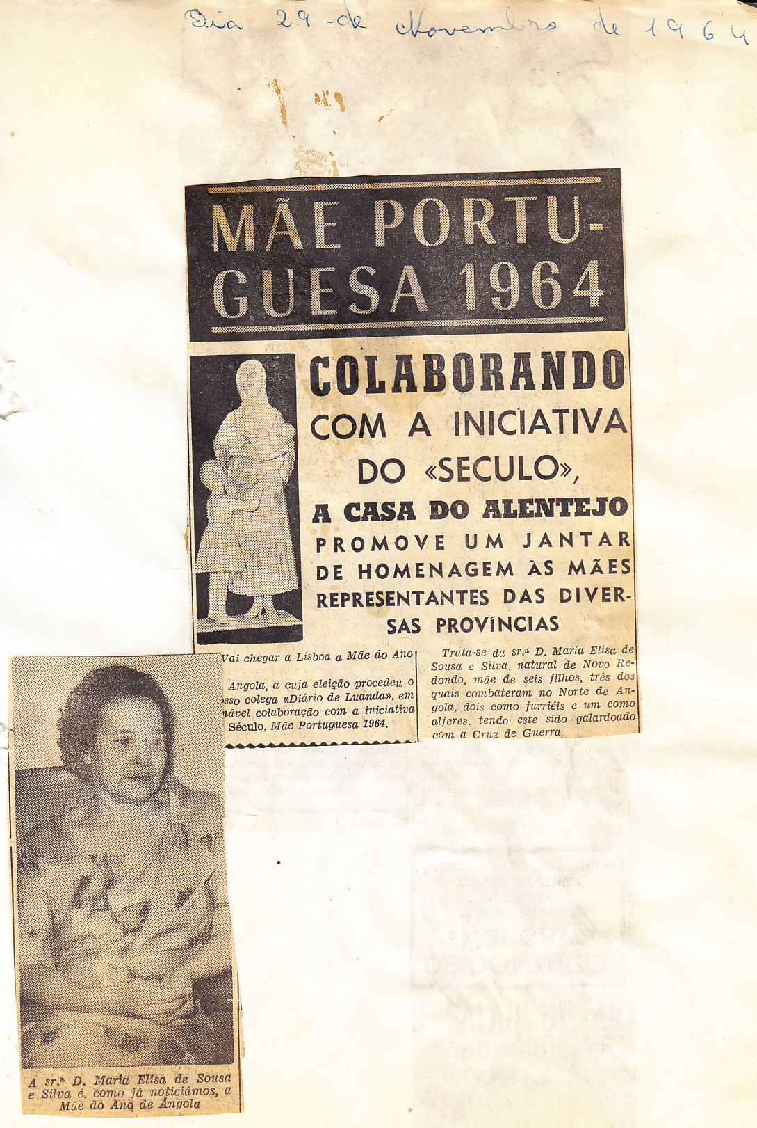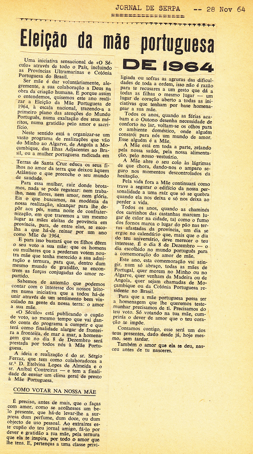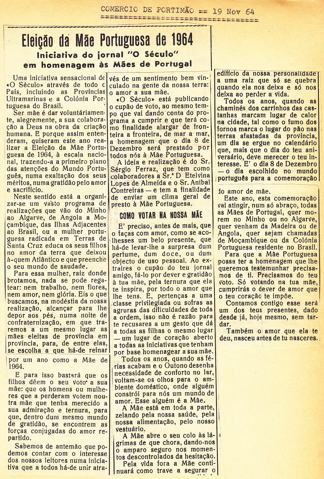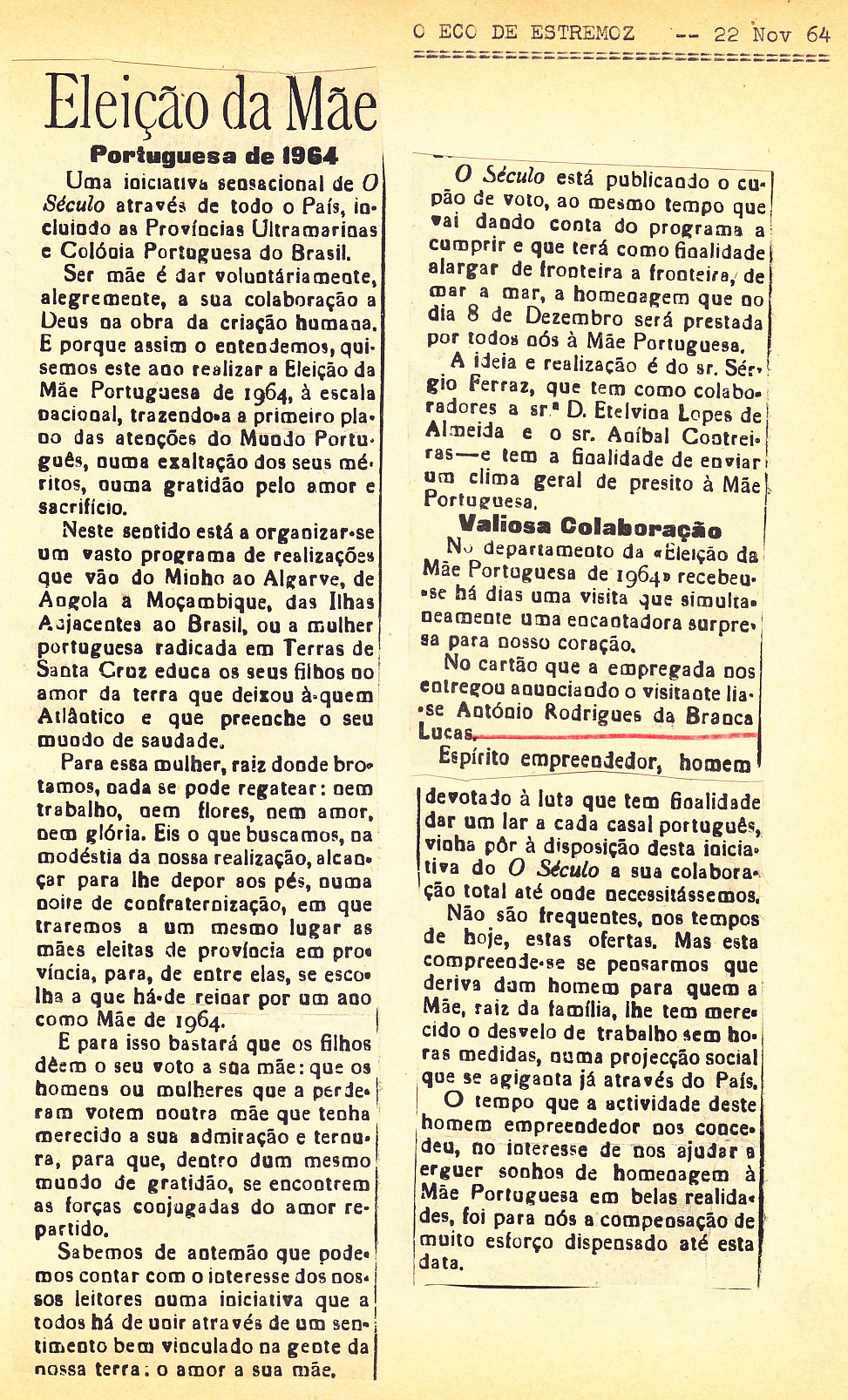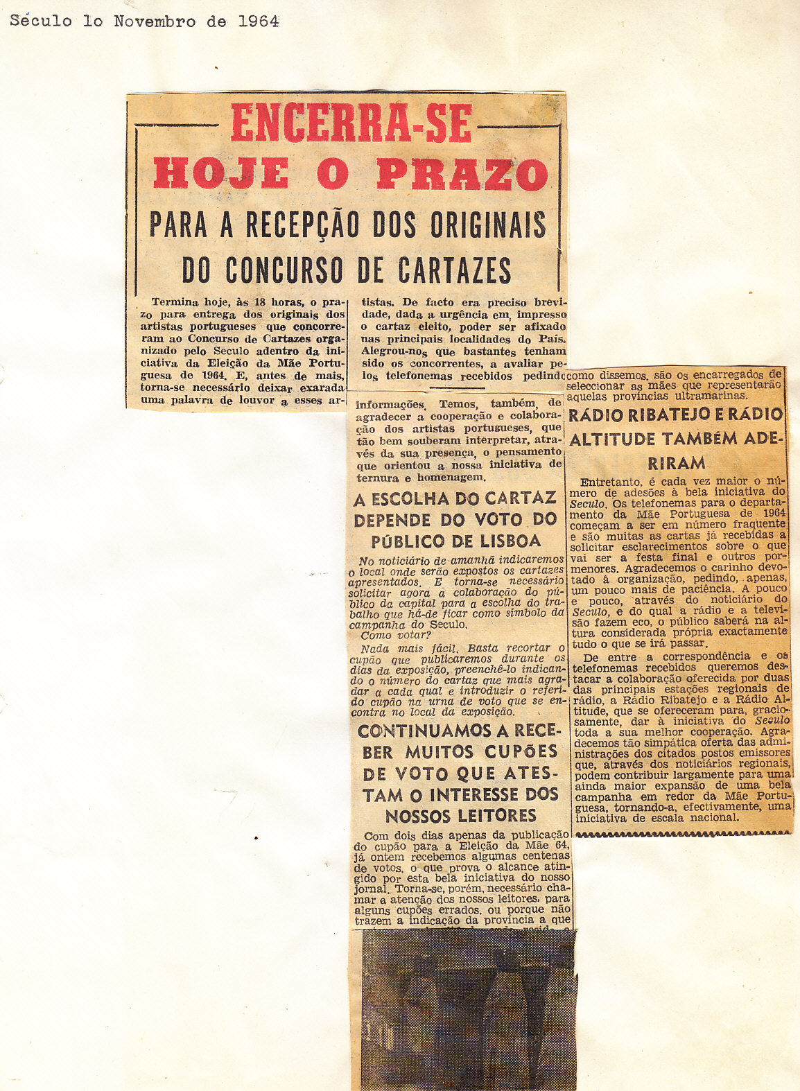 Entrou, por aquisição, um dossier de fotografias, recortes, panfletos e outros materiais relativos à “Eleição da Mãe Portuguesa” em 1964. O dossier inclui alguns documentos pessoais de Sérgio Ferraz, jornalista, que em conjunto com o jornal O Século organizou a iniciativa. Sérgio Ferraz foi pioneiro de algumas formas de publicidade, como era o caso dos sinais luminosos. Para além disso, estão incluídas fotografias, bilhetes, e recortes relativos ao evento.