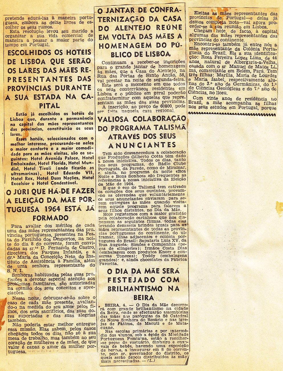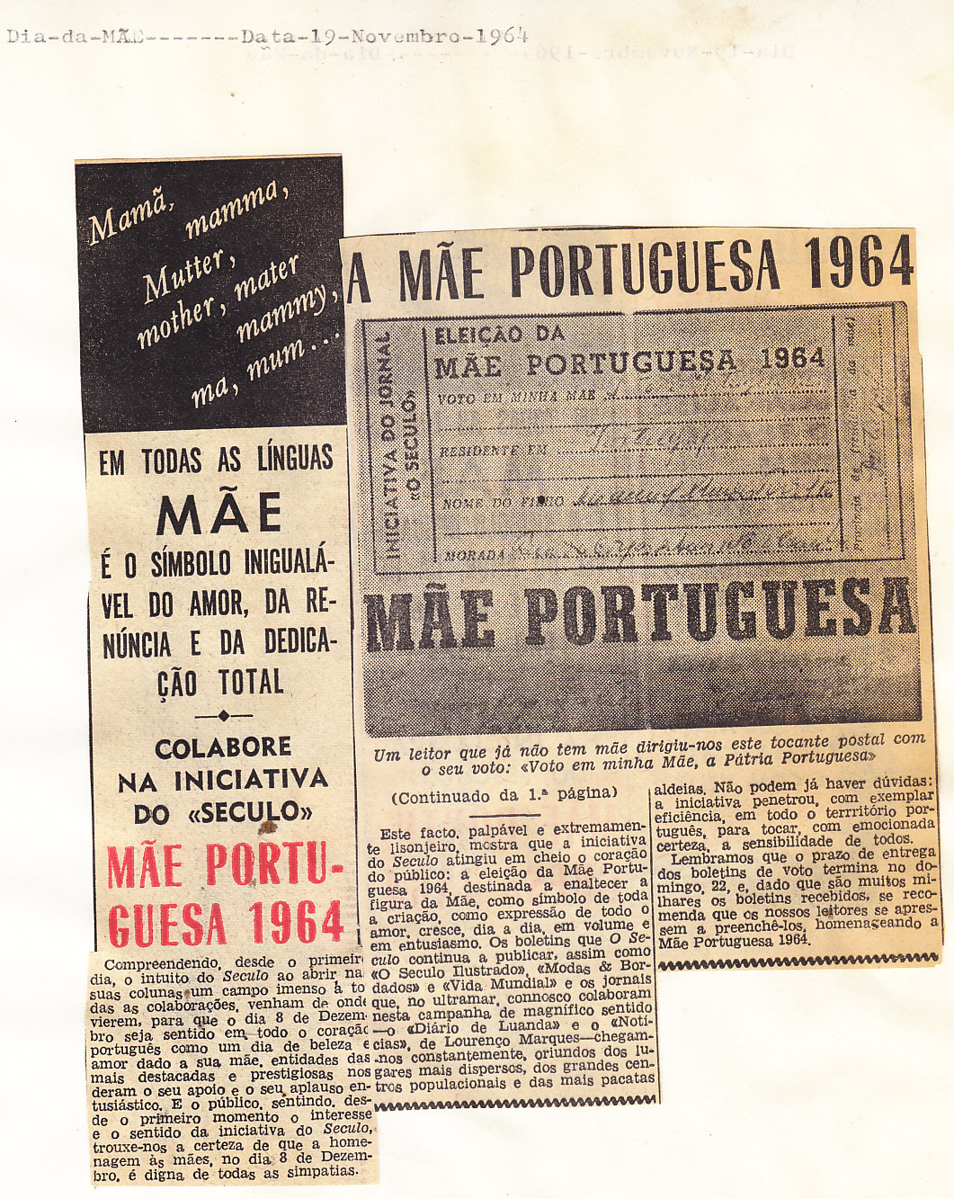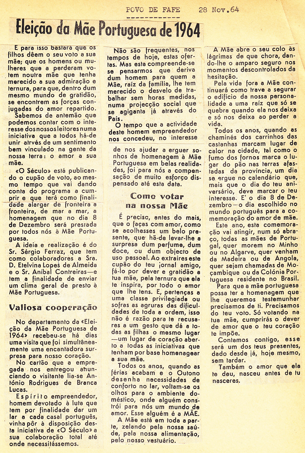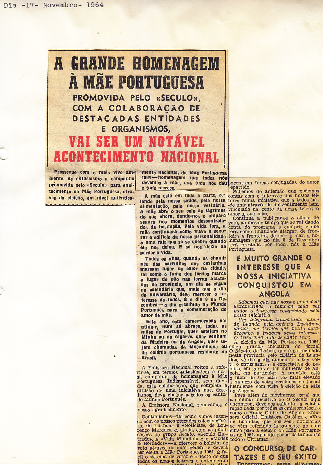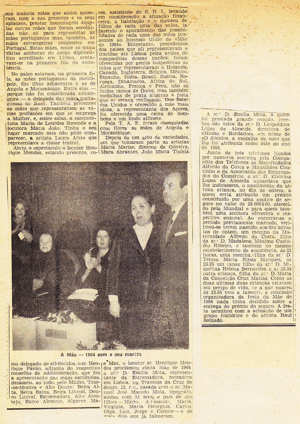 Entrou, por aquisição, um dossier de fotografias, recortes, panfletos e outros materiais relativos à “Eleição da Mãe Portuguesa” em 1964. O dossier inclui alguns documentos pessoais de Sérgio Ferraz, jornalista, que em conjunto com o jornal O Século organizou a iniciativa. Sérgio Ferraz foi pioneiro de algumas formas de publicidade, como era o caso dos sinais luminosos. Para além disso, estão incluídas fotografias, bilhetes, e recortes relativos ao evento.