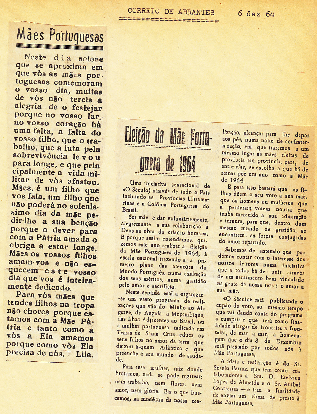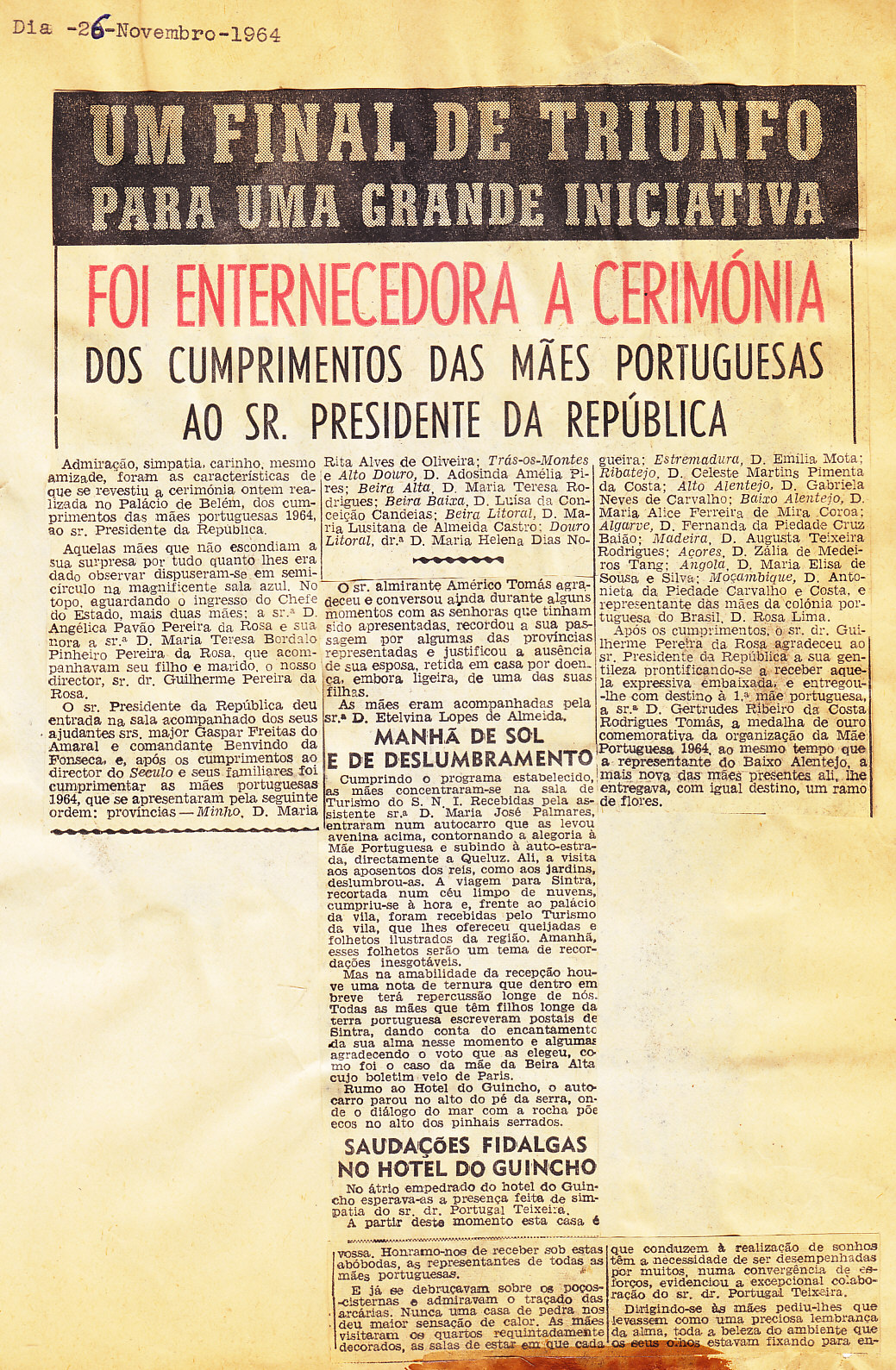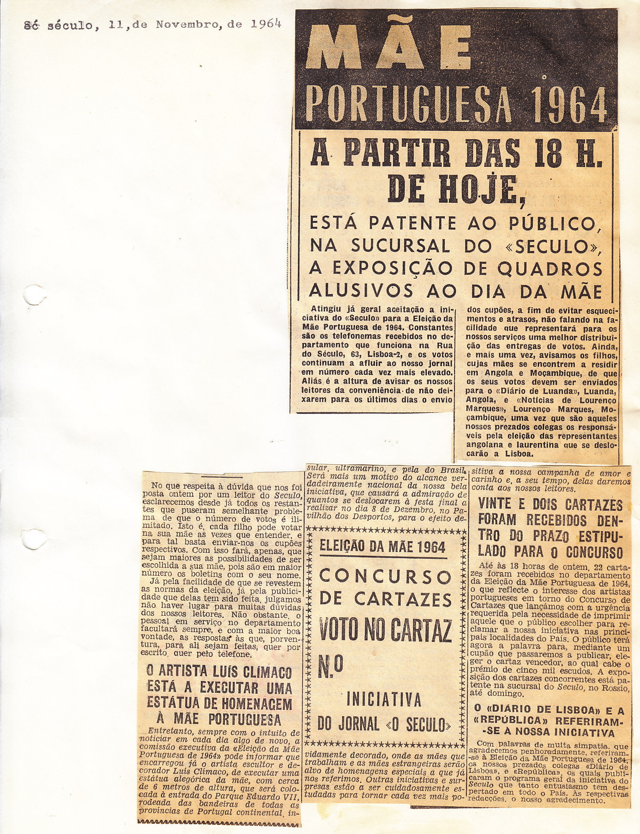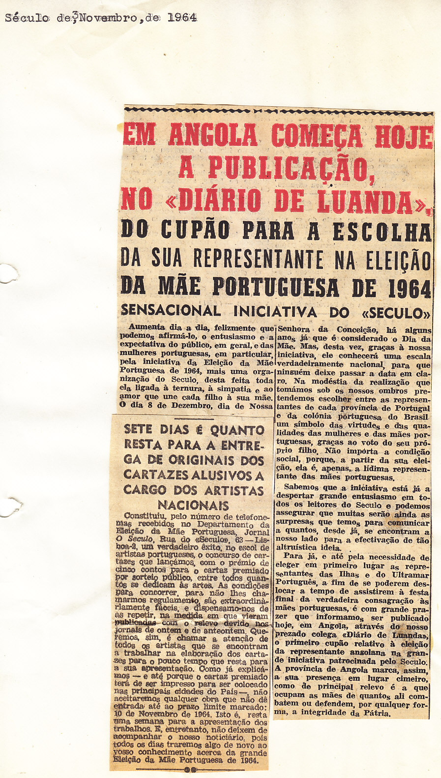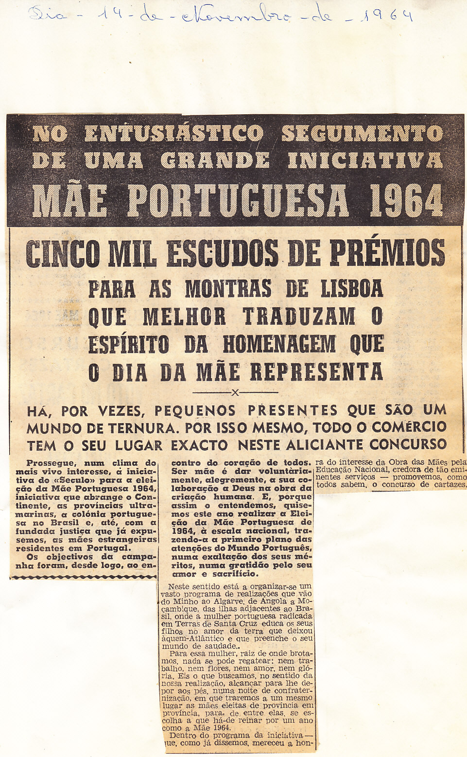Entrou, por aquisição, um dossier de fotografias, recortes, panfletos e outros materiais relativos à “Eleição da Mãe Portuguesa” em 1964. O dossier inclui alguns documentos pessoais de Sérgio Ferraz, jornalista, que em conjunto com o jornal O Século organizou a iniciativa. Sérgio Ferraz foi pioneiro de algumas formas de publicidade, como era o caso dos sinais luminosos. Para além disso, estão incluídas fotografias, bilhetes, e recortes relativos ao evento.