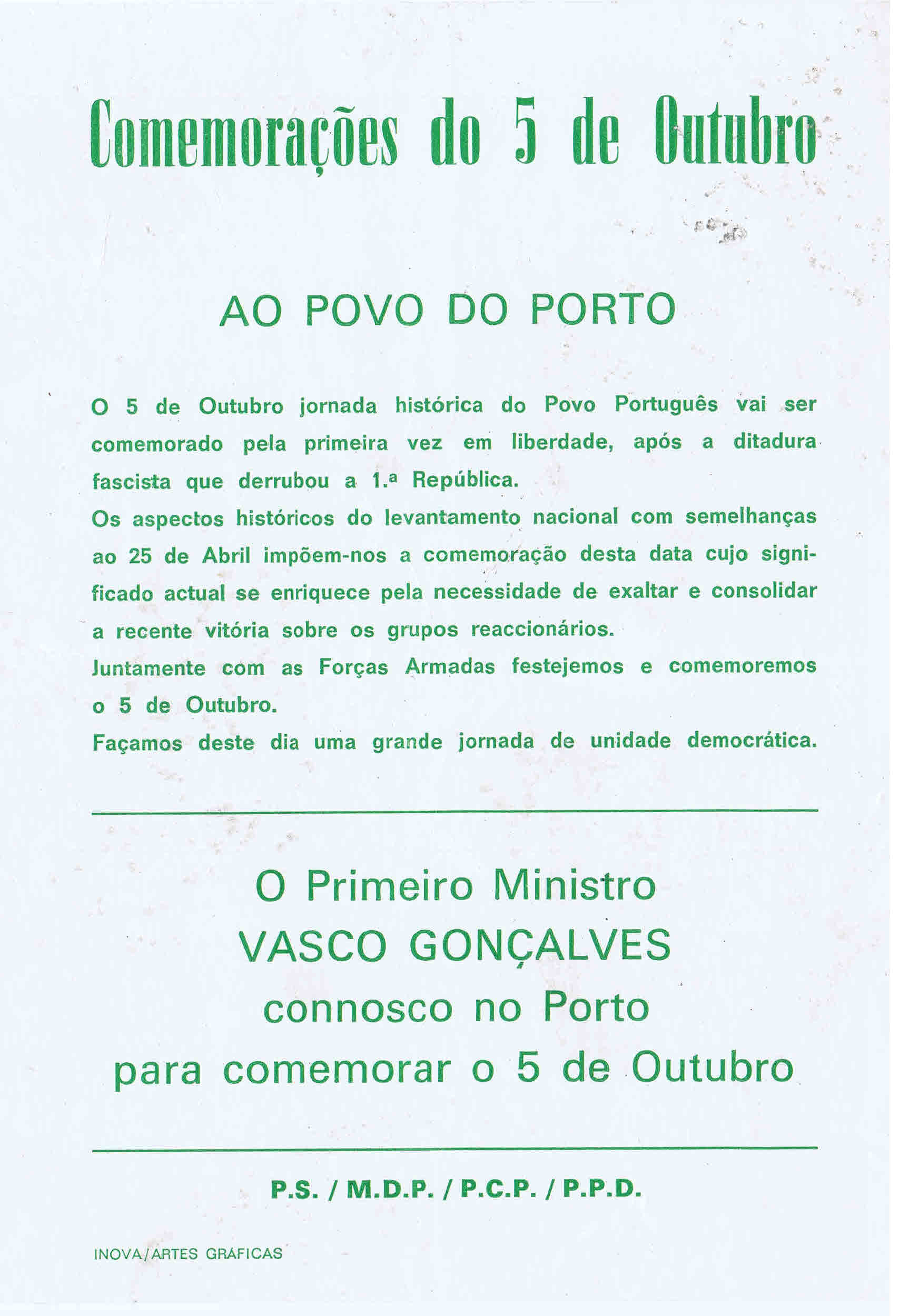 PS / MDP / PCP / PPD – COMEMORAÇÕES DO 5 DE OUTUBRO COM VASCO GONÇALVES (PORTO, 1974)
