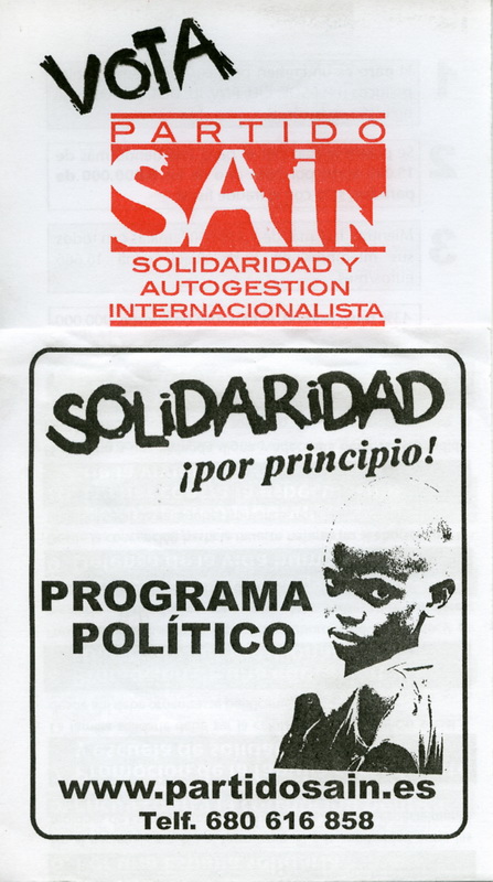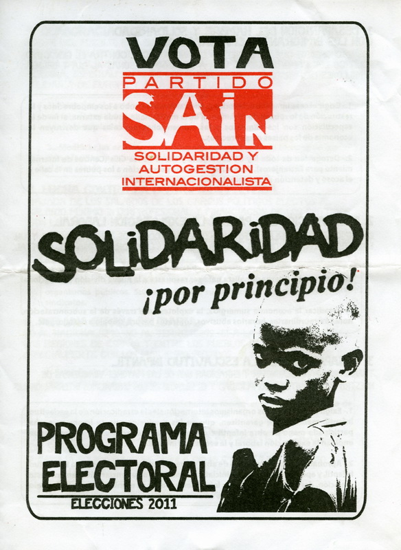 ESPANHA – ELEIÇÕES LEGISLATIVAS DE 2011 – PARTIDO SOLIDARIDAD Y AUTOGESTIÓN INTERNACIONISTA (SAIN) 27/08/2014 JPP 2011, 2011 - Espanha - eleições gerais, ARQUIVO, Espanha, Panfletos - folhetos - folhas volantes - prospectos tarjetas, PARTIDO SOLIDARIDAD Y AUTOGESTIÓN INTERNACIONALISTA (SAIN), Processos eleitorais 0 * Solidaridad por Principio! Programa Politico Solidaridad por Principio! Programa Electoral Click to print (Opens in new window) Print Click to email a link to a friend (Opens in new window) Email Click to share on Facebook (Opens in new window) Facebook Click to share on X (Opens in new window) X Click to share on LinkedIn (Opens in new window) LinkedIn Like this:Like Loading...