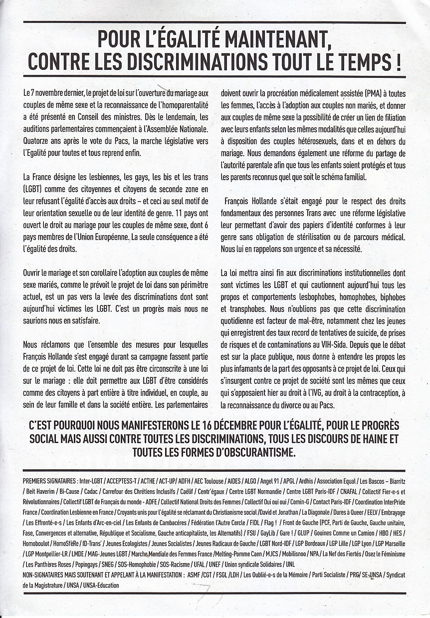 FRANÇA – MANIFESTAÇÃO “PELA IGUALDADE HOJE! CONTRA AS DISCRIMINAÇÕES SEMPRE!” (PARIS, 16 DE DEZEMBRO DE 2013) 05/09/2014 JPP 2013, ARQUIVO, França, Manifestações protestos, Panfletos - folhetos - folhas volantes - prospectos tarjetas, Paris 0 Print (Opens in new window) Print Email a link to a friend (Opens in new window) Email Share on Facebook (Opens in new window) Facebook Share on X (Opens in new window) X Share on LinkedIn (Opens in new window) LinkedIn Like this:Like Loading...