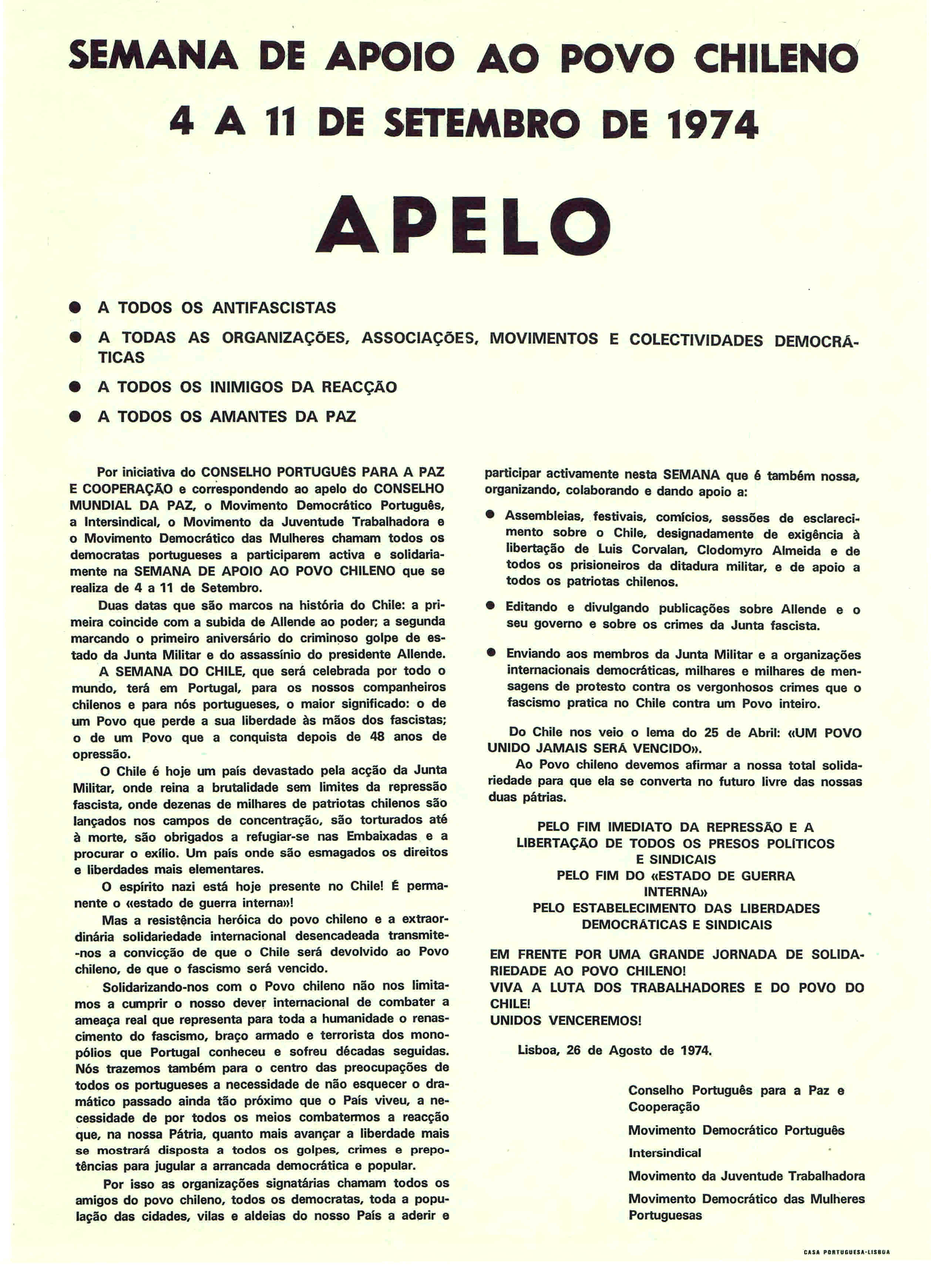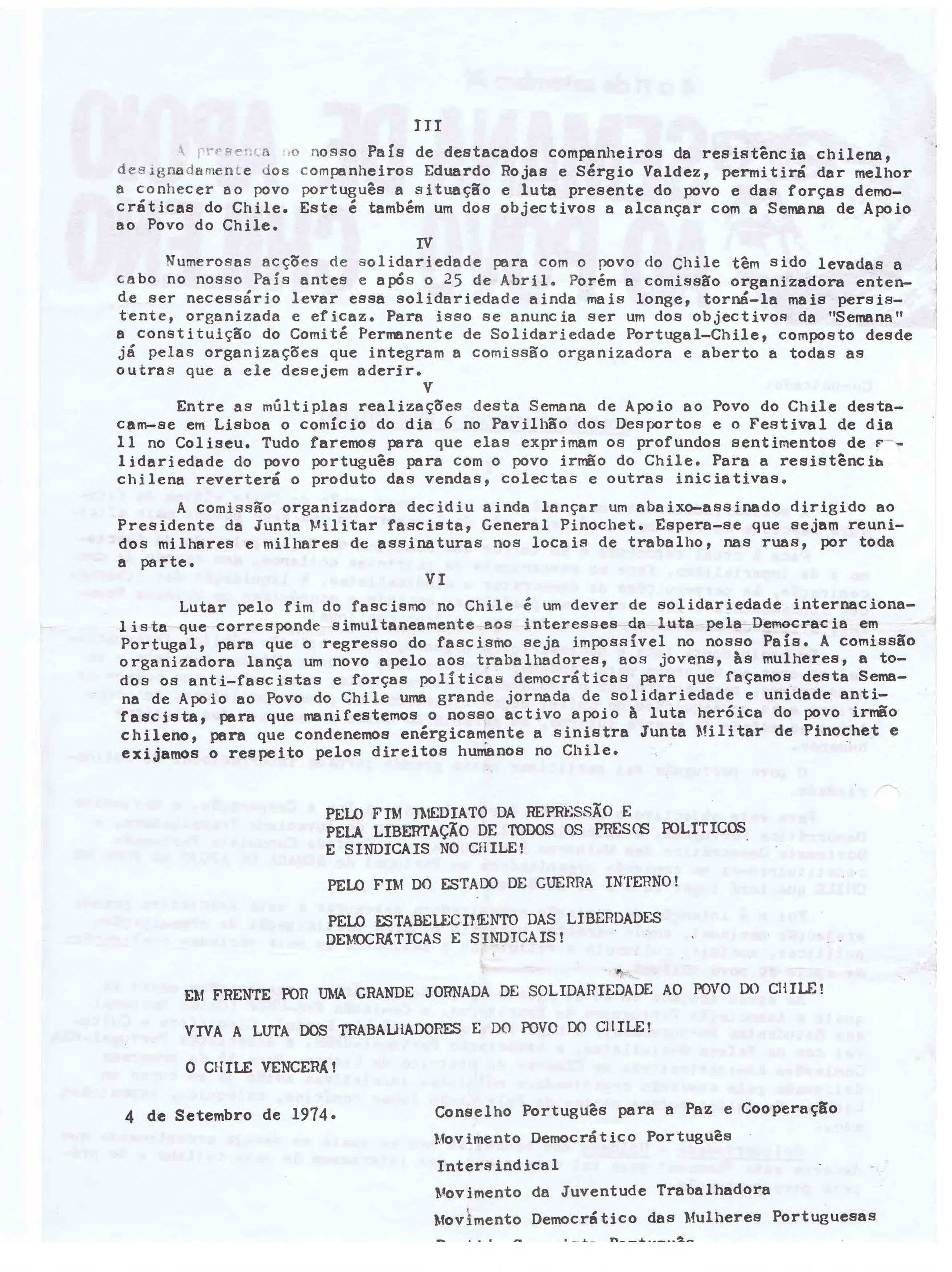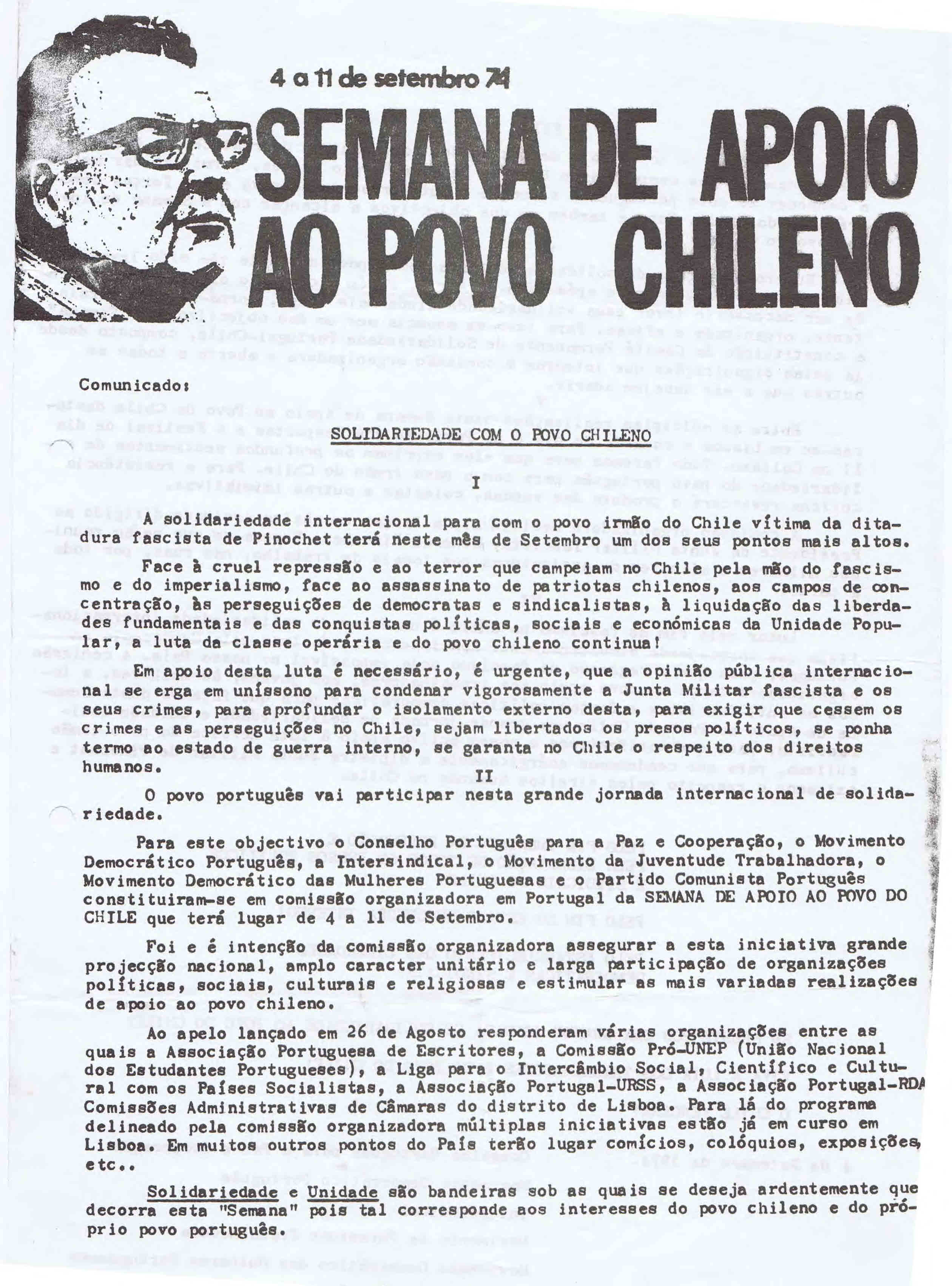 CONSELHO PORTUGUÊS DA PAZ E COOPERAÇÃO – 1974 14/09/2014 JPP 1974, ARQUIVO, CONSELHO PORTUGUÊS PARA A PAZ E COOPERAÇÃO (CPPC), Movimentos: pacifismo / contra as guerras, Panfletos - folhetos - folhas volantes - prospectos tarjetas 0 * Ver SEMANA DE SOLIDARIEDADE COM O POVO CHILENO (4 A 11 DE SETEMBRO DE 1974) Print (Opens in new window) Print Email a link to a friend (Opens in new window) Email Share on Facebook (Opens in new window) Facebook Share on X (Opens in new window) X Share on LinkedIn (Opens in new window) LinkedIn Like this:Like Loading...