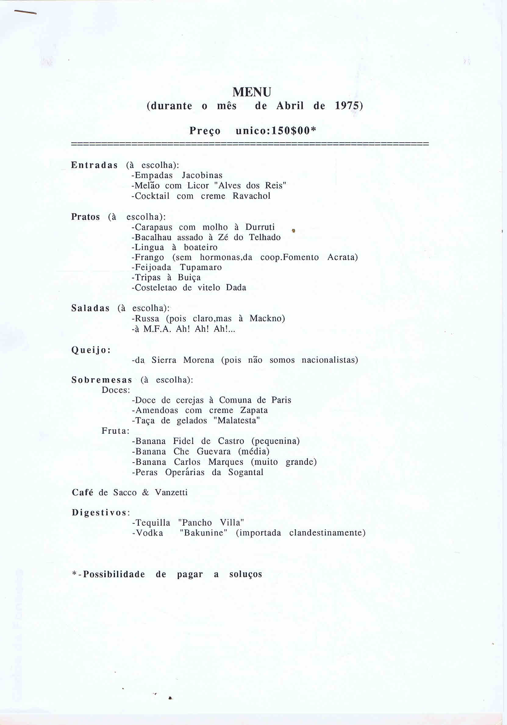 RESTAURANTE OS ANARQUISTAS – MENU DE ABRIL DE 1975 05/12/2014 JPP 1975, ARQUIVO, Movimentos: anarquismo, Panfletos - folhetos - folhas volantes - prospectos tarjetas, RESTAURANTE OS ANARQUISTAS 0 FCF-DFCG Print (Opens in new window) Print Email a link to a friend (Opens in new window) Email Share on Facebook (Opens in new window) Facebook Share on X (Opens in new window) X Share on LinkedIn (Opens in new window) LinkedIn Like this:Like Loading...