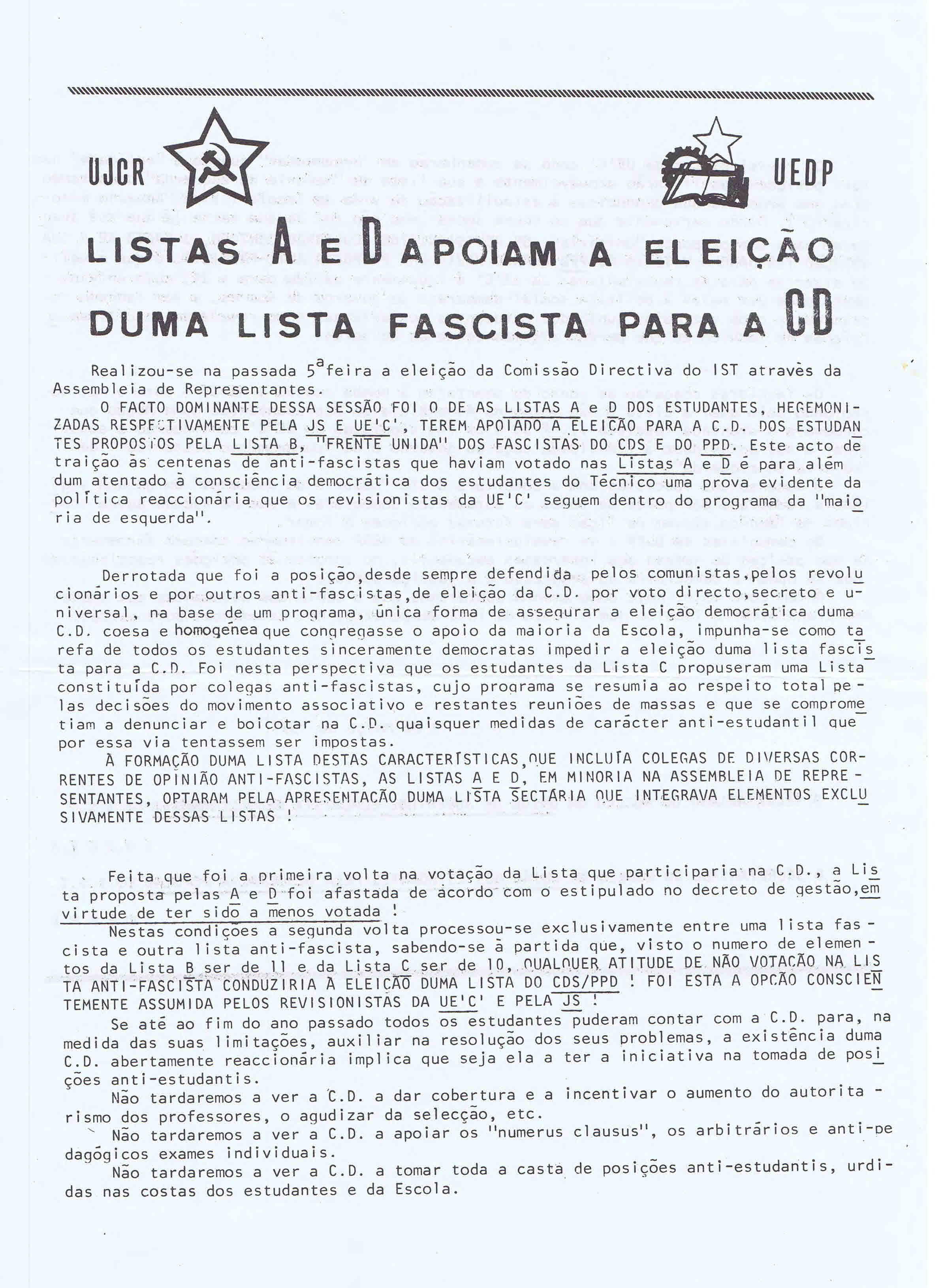 COMISSÃO DIRECTIVA DO IST – ELEIÇÕES (1977) 31/12/2014 JPP 1977, ARQUIVO, INSTITUTO SUPERIOR TÉCNICO (IST), Panfletos - folhetos - folhas volantes - prospectos tarjetas, UNIÃO DA JUVENTUDE COMUNISTA REVOLUCIONÁRIA (UJCR), UNIÃO DOS ESTUDANTES PELA DEMOCRACIA POPULAR (UEDP) 0 Print (Opens in new window) Print Email a link to a friend (Opens in new window) Email Share on Facebook (Opens in new window) Facebook Share on X (Opens in new window) X Share on LinkedIn (Opens in new window) LinkedIn Like this:Like Loading...