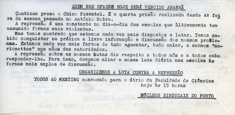 NÚCLEOS SINDICAIS DO PORTO 25/09/2016 JPP ARQUIVO, NÚCLEOS SINDICAIS DO PORTO, Porto 0 * Estudantes do Porto estão Dispostos a Lutas Contra a Repressão Textos de Apoio Texto de Apoio nº 1 Texto de Apoio nº 3 (com correcções manuscritas) A Luta não é de 100 é de Todos Sobre a Repressão Ver FOLHA INFORMATIVA DOS NÚCLEOS SINDICAIS DO PORTO Print (Opens in new window) Print Email a link to a friend (Opens in new window) Email Share on Facebook (Opens in new window) Facebook Share on X (Opens in new window) X Share on LinkedIn (Opens in new window) LinkedIn Like this:Like Loading...