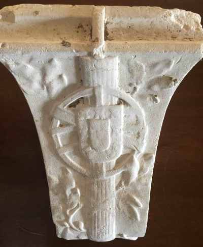 Trata-se de um objecto decorativo em gesso, que pode estar (ou ter sido) partido na parte superior, combinando a esfera armilar com o que parece um fascio. Alguém sabe mais alguma coisas sobre este ou outros objectos do mesmo tipo?