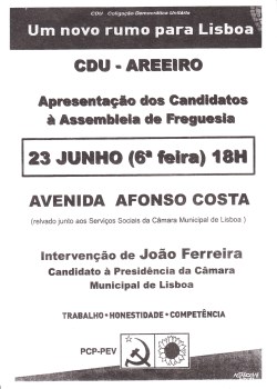 ELEIÇÕES AUTÁRQUICAS DE 2017 – LISBOA – FREGUESIA DO AREEIRO – CDU 24/06/2017 JPP 2017, 2017 - Eleições Autárquicas, Areeiro, ARQUIVO, Cartazes - faixas - outdoors, COLIGAÇÃO DEMOCRÁTICA UNITÁRIA (CDU), Lisboa, Processos eleitorais 0 Print (Opens in new window) Print Email a link to a friend (Opens in new window) Email Share on Facebook (Opens in new window) Facebook Share on X (Opens in new window) X Share on LinkedIn (Opens in new window) LinkedIn Like this:Like Loading...