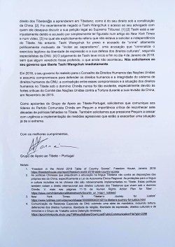 Carta enviada à embaixada da RP da China, em Lisboa