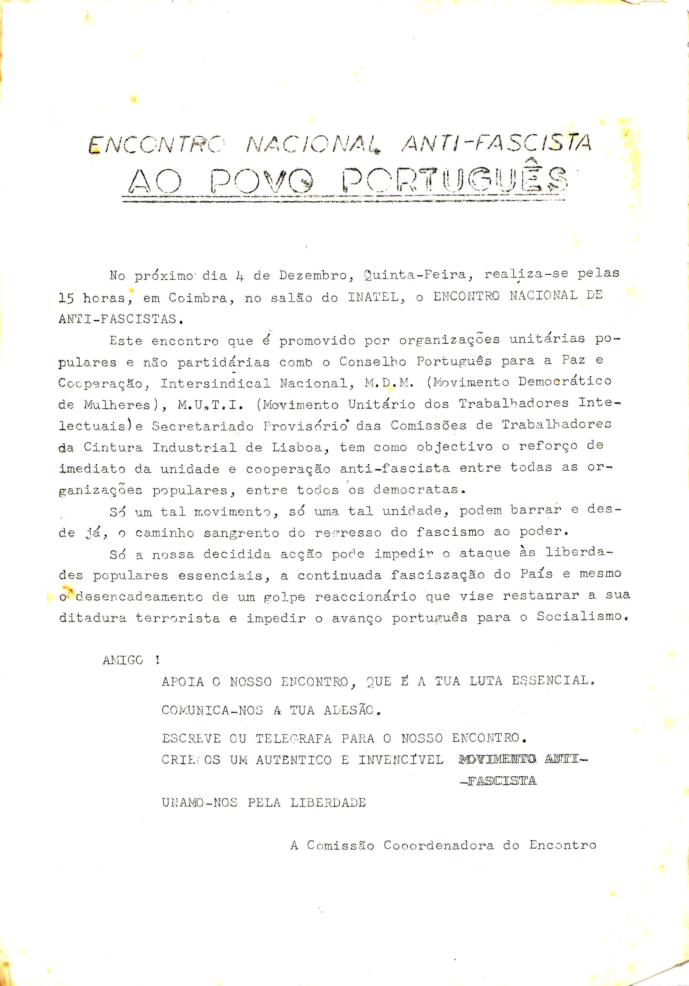 |  | 1975/12/04 | | | | | | | | ENCONTRO NACIONAL ANTIFASCISTA (COIMBRA, 4 DE DEZEMBRO DE 1975) | |