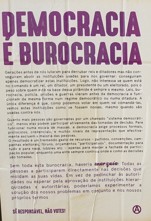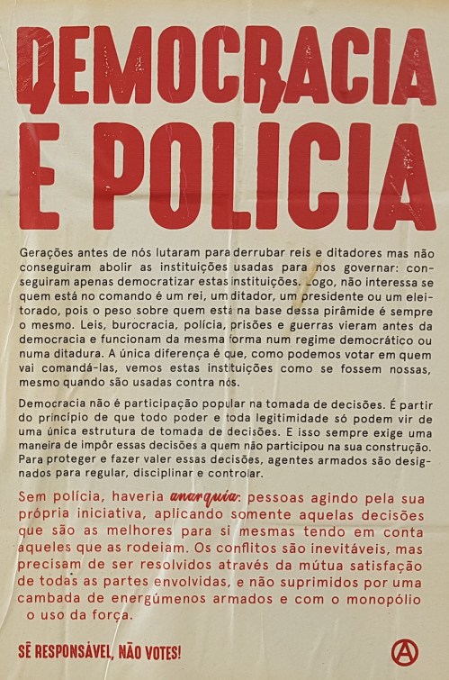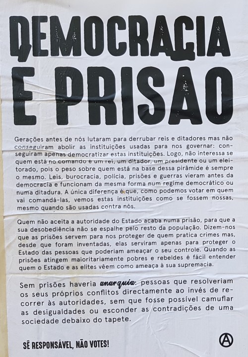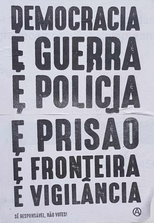 ELEIÇÕES LEGISLATIVAS DE 2019 – FAIXA E CARTAZES ANARQUISTAS CONTRA O VOTO 12/10/2019 JPP 2019, 2019 - Eleições legislativas, ARQUIVO, Cartazes - faixas - outdoors, Fotografias, Lisboa, Movimentos: anarquismo, Processos eleitorais 0 Print (Opens in new window) Print Email a link to a friend (Opens in new window) Email Share on Facebook (Opens in new window) Facebook Share on X (Opens in new window) X Share on LinkedIn (Opens in new window) LinkedIn Like this:Like Loading...
