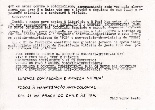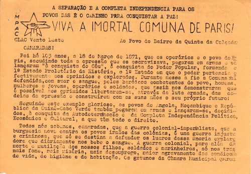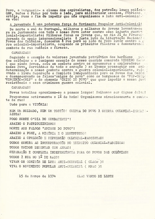 CLAC VENTO DE LESTE 09/02/2020 JPP 1974, ARQUIVO, CLAC VENTO DE LESTE, COMITÉS DE LUTA ANTI-COLONIAIS (CLACS), MOVIMENTO POPULAR ANTI-COLONIAL (MPAC), Oposição portuguesa / Publicações clandestinas, Panfletos - folhetos - folhas volantes - prospectos tarjetas 0 Print (Opens in new window) Print Email a link to a friend (Opens in new window) Email Share on Facebook (Opens in new window) Facebook Share on X (Opens in new window) X Share on LinkedIn (Opens in new window) LinkedIn Like this:Like Loading...