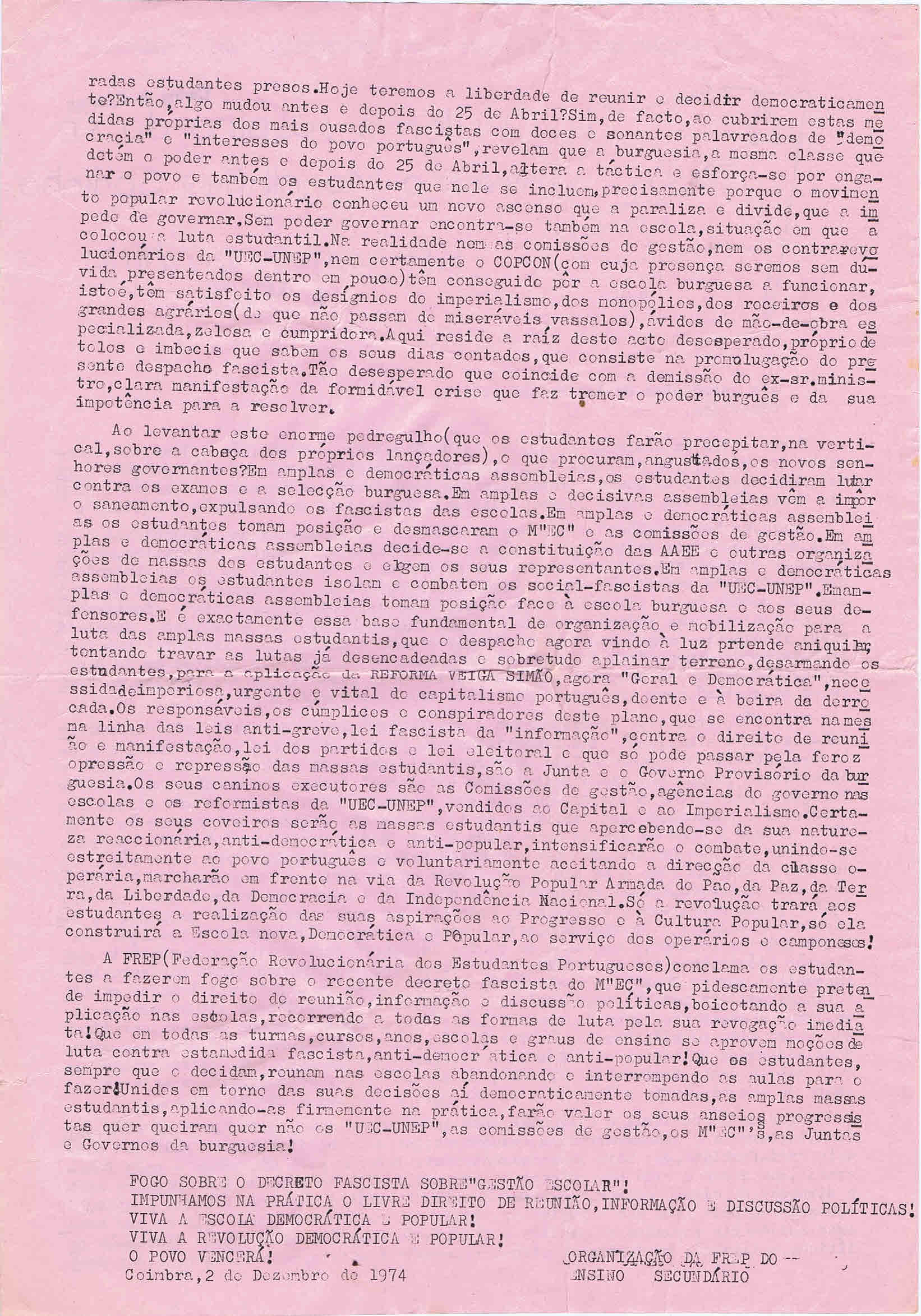FREP – 1974 09/02/2020 JPP 1974, ARQUIVO, FEDERAÇÃO REVOLUCIONÁRIA DOS ESTUDANTES PORTUGUESES (FREP), Panfletos - folhetos - folhas volantes - prospectos tarjetas 0 Print (Opens in new window) Print Email a link to a friend (Opens in new window) Email Share on Facebook (Opens in new window) Facebook Share on X (Opens in new window) X Share on LinkedIn (Opens in new window) LinkedIn Like this:Like Loading...