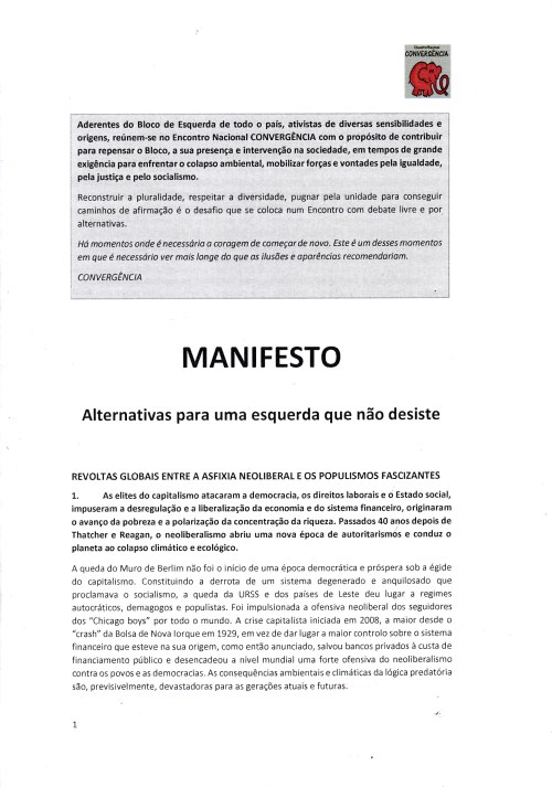 BLOCO DE ESQUERDA – ENCONTRO NACIONAL CONVERGÊNCIA (LISBOA, 8 DE DEZEMBRO DE 2019) JPP 6 anos ago Manifesto – Alternativas para uma esquerda que não desiste Ficha de inscrição e papel timbrado Print (Opens in new window) Print Email a link to a friend (Opens in new window) Email Share on Facebook (Opens in new window) Facebook Share on X (Opens in new window) X Share on LinkedIn (Opens in new window) LinkedIn