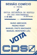 ELEIÇÕES LEGISLATIVAS DE 1983 – CDS 24/03/2020 JPP 1983, 1983 - Eleições legislativas, ARQUIVO, Autocolantes, CENTRO DEMOCRÁTICO-SOCIAL - PARTIDO POPULAR (CDS-PP), Pires, Francisco Lucas, Processos eleitorais 0 IMAGEM1IMAGEM2DATAAUTORTÍTULOBIOORGGEOEVENTONOTAS 1983/03/22CDS 1983/04CDS Print (Opens in new window) Print Email a link to a friend (Opens in new window) Email Share on Facebook (Opens in new window) Facebook Share on X (Opens in new window) X Share on LinkedIn (Opens in new window) LinkedIn Like this:Like Loading...