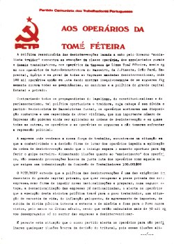 MRPP – TOMÉ FETEIRA 03/04/2020 JPP ARQUIVO, MOVIMENTO REORGANIZATIVO DO PARTIDO DO PROLETARIADO (PCTP/MRPP), Panfletos - folhetos - folhas volantes - prospectos tarjetas, Sindicalismo 0 Plano de acção da ofensiva do Partido na Tomé Feteira [Outubro de 1977] Print (Opens in new window) Print Email a link to a friend (Opens in new window) Email Share on Facebook (Opens in new window) Facebook Share on X (Opens in new window) X Share on LinkedIn (Opens in new window) LinkedIn Like this:Like Loading...