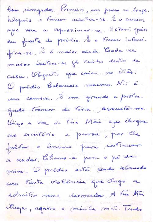De repente, sinto aquele conhecido e costumado tremor no prédio que tem origem na passagem de camions bem carregados. Primeiro, um pouco ao longe. Depois o tremor acentua-se. É o camion que vem a aproximar-se. Estará quási em frente ao prédio. E o tremor intensifica-se. E é maior ainda. Cada vez maior. Sentem-se já ruídos dentro de casa. Objectos que caiem no chão. O préedio balanceia mesmo. Não é um camion. É um grande e prolongado tremor de terra. Assusto-me. Oiço a voz da tua Mãi que chegou ao escritório e parou, por lhe faltar o ânimo para continuar a andar. Chamo-a para o pé de mim. O prédio está sendo abanado com tanta violência que chego a admitir uma derrocada. A tua Mãi chega, agarra a minha mão. Tudo treme ainda, mas mais docemente. Pouco a pouco, serenamos. Julga-se que o perigo tenha passado.
