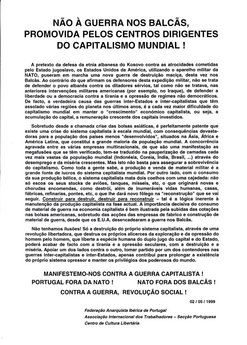 ![]() | 1999/05/02 | FEDERAÇÃO ANARQUISTA IBÉRICA (FAI) | GUERRA DOS BALCÃS |