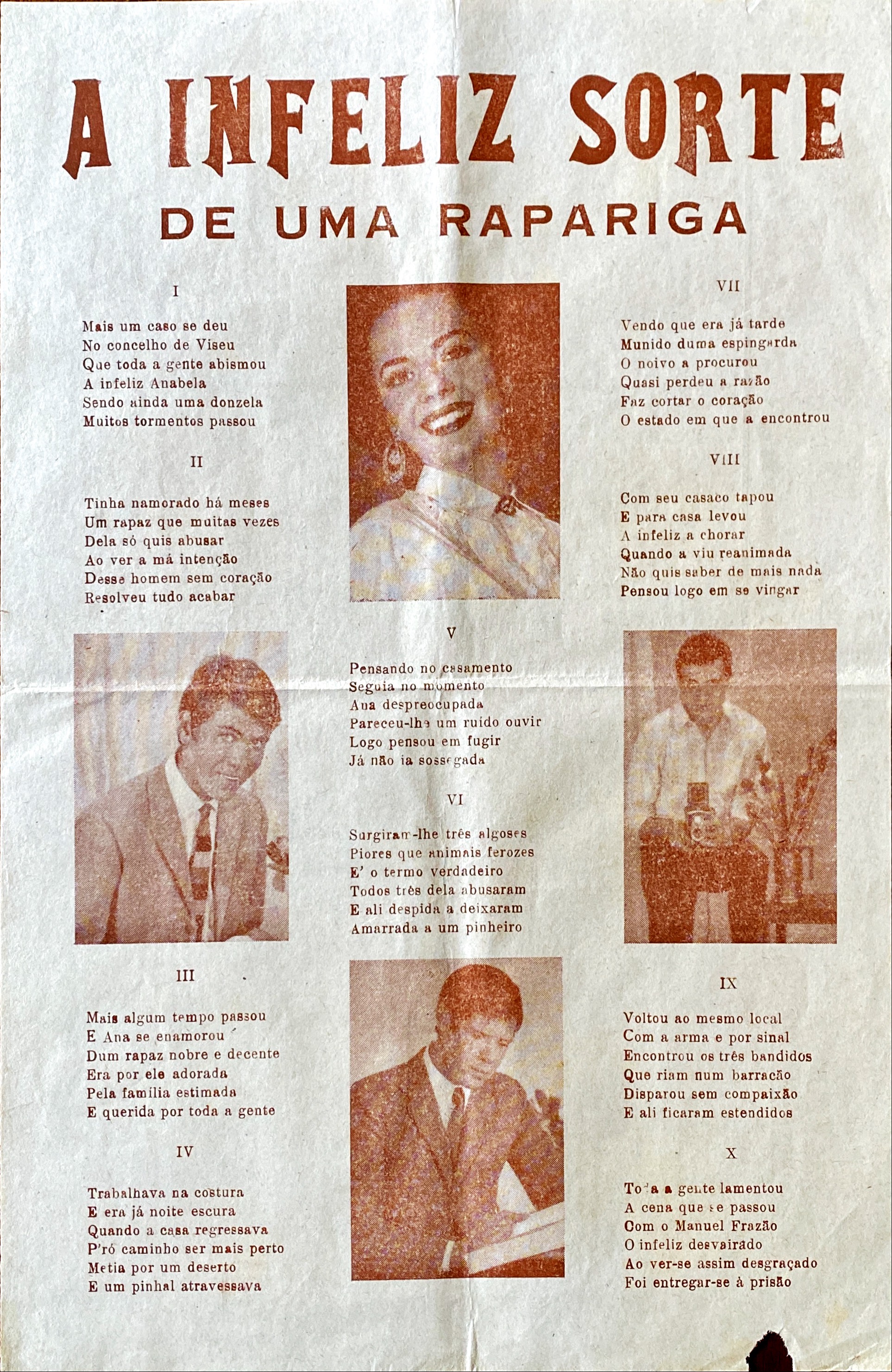 No tempo em que os animais falavam, havia feiras um pouco por todo o lado. E,onde havia feiras, havia folhetos de cordel, ou simples folhas com canções ou versos, muitas vezes sobre o caso do dia,. Ou melhor, o crime do dia. Local; Viseu. Personagens: Anabela, costureira, a vítima; os criminosos, “tres algozes / piores que animais ferozes” e o vingador e também criminoso por dever de honra, Manuel Frazão. A Anabela tinha tido um namorado abusador e afastou-o para arranjar um “rapaz nobre e decente“. Iam casar, mas quem se mete por atalhos mete-se em trabalhos . A Anabela queria chegar depressa a casa, escolheu um caminho perigoso e foi assaltada, violada e deixada nua amarrada a uma árvore. O Manuel Frazão, quando a viu assim, pegou numa espingarda e matou os violadores, que se estavam a “rir” num barracão. Não sei se a história foi assim, mas salvos os detalhes para excitar o público e vender o folheto, não é impossível que o crime em traços largos esteja correctamente descrito. O crime e a pena de morte.