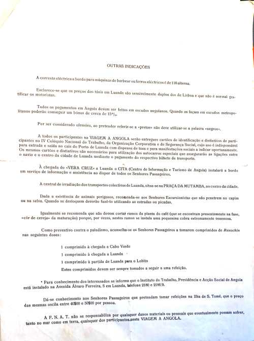 Em 1966, a Federação Nacional para a Alegria do Trabalho (hoje INATEL), uma das instituições criadas pelo Estado Novo nos anos trinta ao modelo italiano e alemão, resolveu organizar uma viagem a Angola para “trabalhadores”. As viagens recreativas às colónias não eram tão vulgares como se pensaria e eram quase sempre enquadradas pelas instituições do regime. Neste caso, o prospecto com instruções veio parar ao ARQUIVO EPHEMERA, e parecia um papel trivial e pouco interessante. Como nós sabemos muito bem que o Diabo se esconde nos detalhes, fomos lê-lo. Há prevenções para não se nadar nos rios “por estarem quase todos infestados de jacarés”. Não se deve “penetrar no capim” porque está cheio de animais perigosos e, acima de tudo, “não se deve cortar ramos da planta do café” porque escondem “uma pequenina cobra extremamente venenosa”. Estamos conversados quanto aos perigos da natureza.