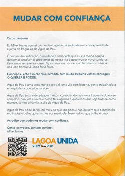 ELEIÇÕES AUTÁRQUICAS DE 2021 – SÃO MIGUEL (AÇORES) – LAGOA – FREGUESIA DE ÁGUA DE PAU – PSD+CDS+PPM 11/10/2021 JPP 2021, 2021 - Eleições autárquicas, ARQUIVO, Água de Pau, CENTRO DEMOCRÁTICO-SOCIAL - PARTIDO POPULAR (CDS-PP), Lagoa (Açores), Panfletos - folhetos - folhas volantes - prospectos tarjetas, PARTIDO SOCIAL-DEMOCRATA (PSD) 0 Print (Opens in new window) Print Email a link to a friend (Opens in new window) Email Share on Facebook (Opens in new window) Facebook Share on X (Opens in new window) X Share on LinkedIn (Opens in new window) LinkedIn Like this:Like Loading...