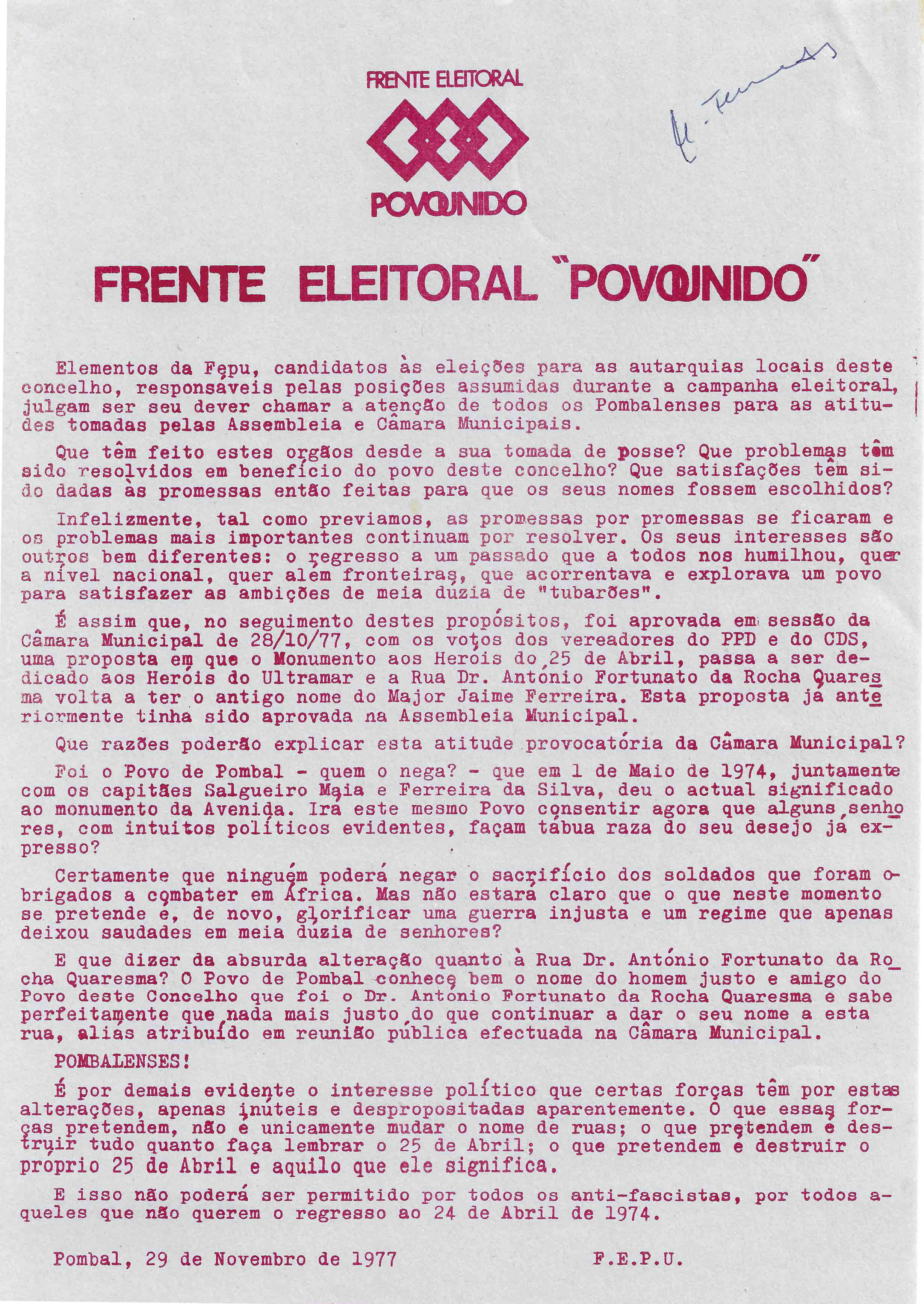 FEPU – POMBAL – 1977 24/11/2021 JPP 1997, 1997 - Eleições autárquicas, ARQUIVO, FRENTE ELEITORAL POVO UNIDO (FEPU), Panfletos - folhetos - folhas volantes - prospectos tarjetas, Pombal 0 Print (Opens in new window) Print Email a link to a friend (Opens in new window) Email Share on Facebook (Opens in new window) Facebook Share on X (Opens in new window) X Share on LinkedIn (Opens in new window) LinkedIn Like this:Like Loading...