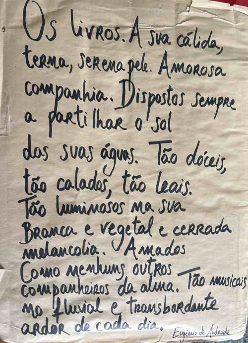 Do ponto de recolha no Porto (galerias MIRA) vieram várias caixas com livros, embrulhadas em transcrições de poemas de Cesariny, Torga, José Gomes Ferreira, Eugénio de Andrade, José Fanha, etc. Agradeço a Acúrcio Moniz e Armando Dourado, programadores dos poemas no MIRA, a oferta.
