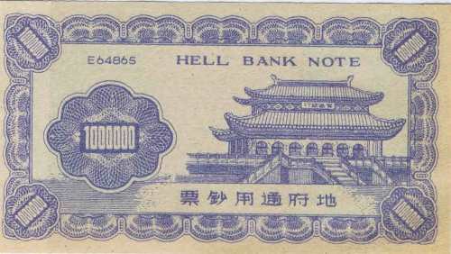 Dinheiro de imitação feito para ser queimado em honra dos antepassados na China e no Extremo Oriente.