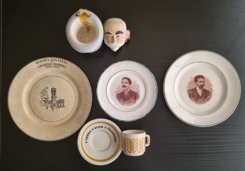 “Da I República ao PREC, passando pelo Estado Novo. Cartola e busto de Bernardino Machado (1851 – 1944); prato com o rosto de Alexandre Braga, filho (1868 – 1921); Prato com o rosto de Afonso Costa (1871 -1937); prato com representação da Torre do Relógio da Universidade de Coimbra, alusivo à Queima das Fitas em Lourenço Marques, Maio de 1956; pires e chávena da Fábrica de Louças de Sacavém, com a frase “A Terra a Quem a Trabalha”, 1975. Conjunto de objectos, espólio de Vânia Sampaio. O maior arquivo privado do país agradece.”
