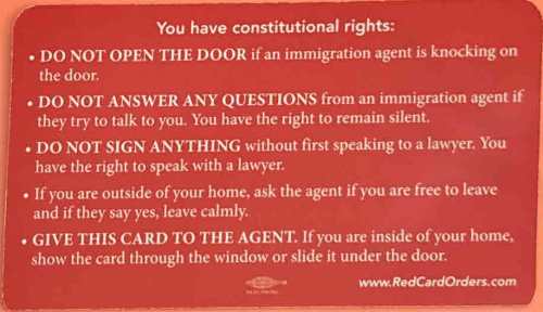 The other side, in English, outlines the person’s rights for an ICE agent: