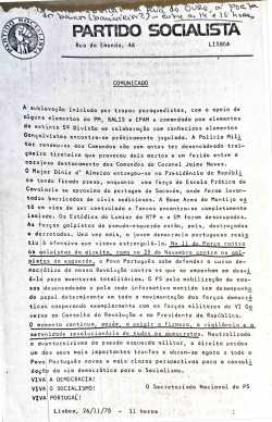 DOCUMENTOS DO ARQUIVO EPHEMERA SOBRE O 25 DE NOVEMBRO (9) – PS E O 25 DE NOVEMBRO (2) – COMUNICADO (26 DE NOVEMBRO ÀS 11 HORAS)